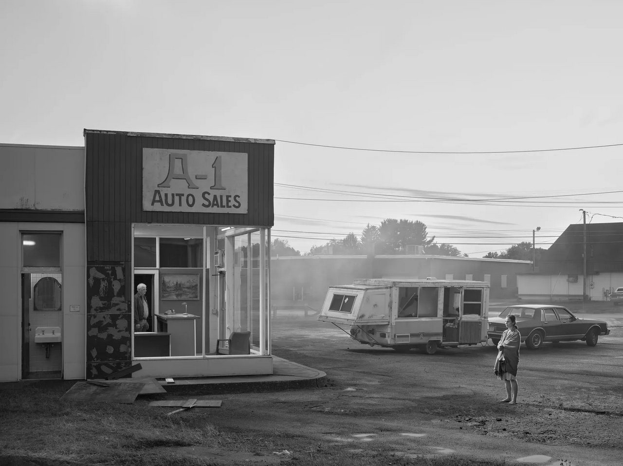 The visual atmosphere of the series is unmistakable. Working exclusively in black and white, Crewdson creates a melancholic twilight world where subtle lighting effects—fog, smoke, and artificial rain—transform familiar suburban landscapes into something uncanny. The aesthetic evokes the dramatic chiaroscuro of film noir and the quiet psychological tension found in the paintings of Edward Hopper. In these images, the ordinary becomes strangely theatrical, and the boundary between fiction and reality begins to dissolve.