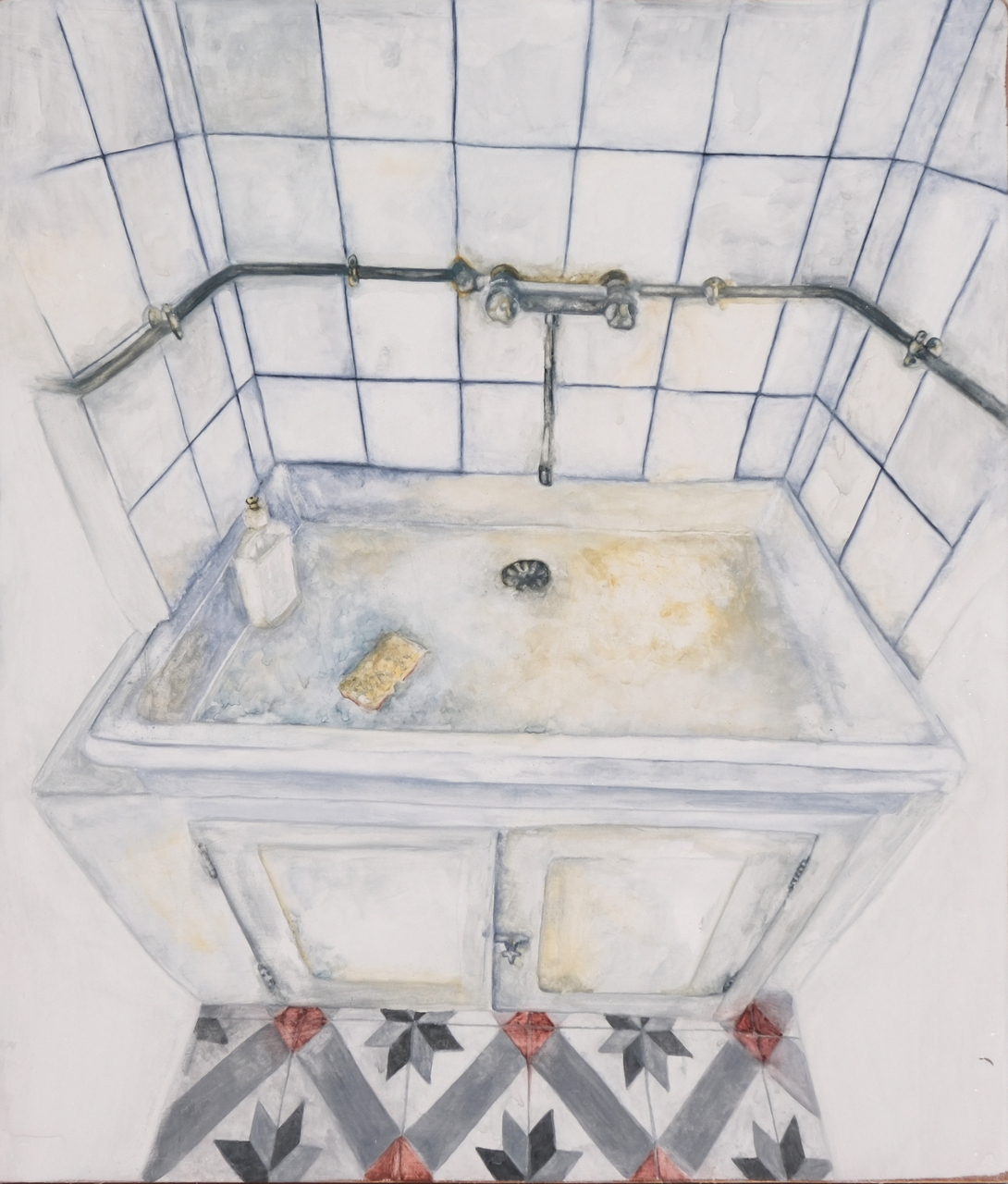 At the core of Tindara Spartà’s work lies what she describes as an angst-driven, aggressive creative process. Her visual language frequently evokes houses that collapse, implode, or drift away—structures destabilized both physically and metaphorically. These recurring images operate as projections of inner states, where architecture becomes a fragile container of experience rather than a stable refuge. Spartà consistently interrogates the relationship between everyday objects and their environments, focusing on the tensions that arise when the familiar is displaced. Within her compositions, domestic imagery is transformed into a symbolic vocabulary charged with subtle humor and a persistent, underlying unease. In her solo exhibition “MAD HOUSE” Spartà turns explicitly to the concept of the house as both subject and system. The interior is no longer a passive setting but an active, almost sentient terrain—dense, disorienting, and as unknowable as an unexplored landscape. Functional elements such as tiles, pipes, doors, and corners—typically overlooked—are reimagined as openings or vital organs of a living structure. These components expand through repetition, forming grid-like patterns that envelop the space. Motif and structure become the mechanisms through which the work maintains coherence, allowing the viewer to navigate an environment that is otherwise unstable and fragmented. A recurring presence throughout the exhibition is that of dogs. They do not function as anecdotal or decorative figures; rather, they articulate a position within the spatial and emotional logic of the work. For Spartà, dogs embody a mode of inhabiting space defined by attentiveness and permanence. They occupy domestic environments fully—yards, kitchens, hallways—existing in a prolonged present without the impulse to escape. Their relationship to space is not defined by thresholds like doors, but by relational awareness: what matters is not the exit, but the presence of the one who opens it.