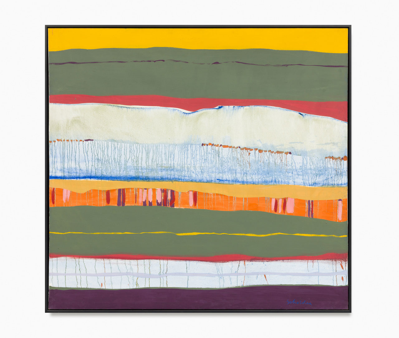 His landscapes echo the colors of New Mexico—soft bands of blue, brown, green, gray, pink, and violet layered across the canvas. They shimmer with light, almost calm and meditative. But against these gentle backgrounds, Scholder’s figures stand out sharply, often set against bold, flat colors. The contrast is striking: the land feels expansive and alive, while the people seem caught in something more intense, more unresolved.