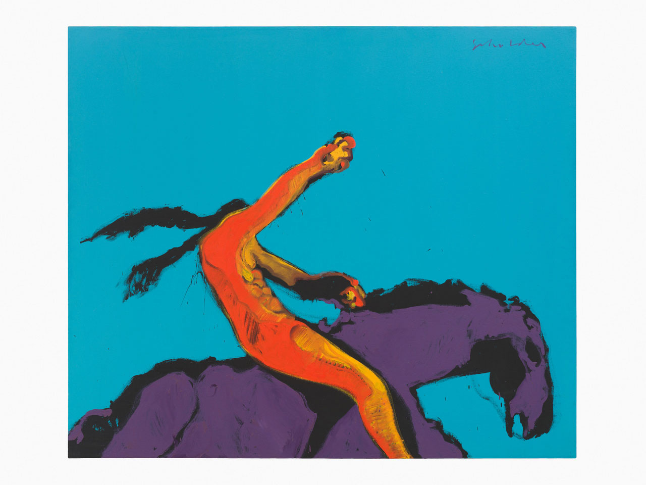 After this, his work shifted again. The intensity softened. He began painting scenes drawn from popular culture—Hollywood Westerns, historical references, figures on horseback in open landscapes. These images might seem calmer, even nostalgic at first glance.