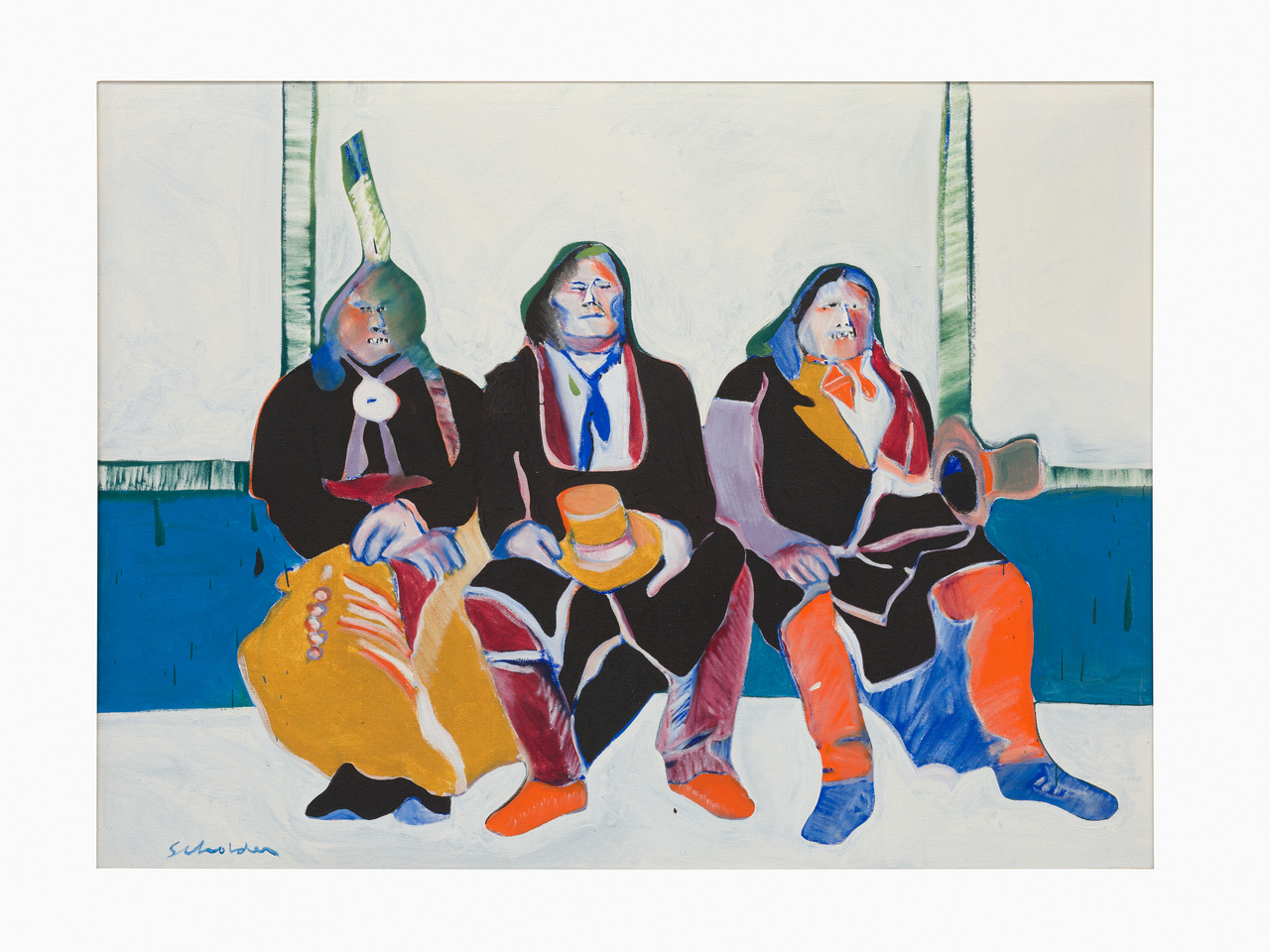 You can see it in the titles of his paintings. Early on, they were simple: “Indian No. 1.” But quickly they became more charged: “Mad Indian”, “Monster Indian”, “Insane Indian”. Others placed the figure in everyday situations—”Indian in Car, Indian at the Bus Depot”. These weren’t distant or romantic figures; they were present, complicated, and often troubled. Scholder refused to make images that were easy to consume. His figures can feel haunted, as if carrying history within them—and that’s precisely why they matter.