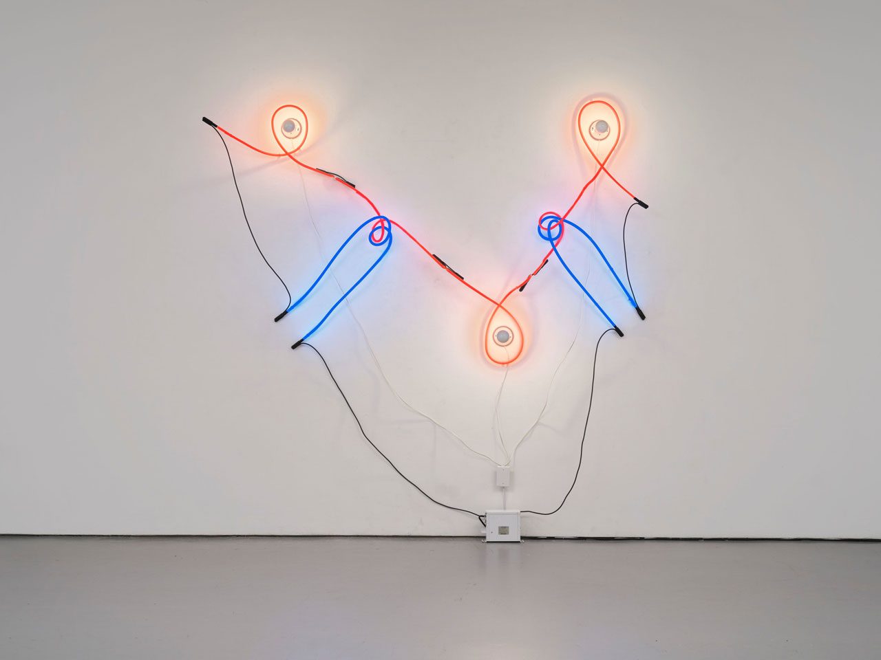 Keith Sonnier studied art at the University of South-western Louisiana in Lafayette, and after a year in Paris, he received a stipend to teach at Rutgers University where he studied with Robert Morris and became a member of the Minimalist influenced “Rutgers Group” that incorporated industrial materials. In his early works, Keith Sonnier mainly used materials are not normally associated with the production of art: lead foil, strings, mesh wire, latex, flock material based on cellulose, cloth, but above all lightweight elements that did not possess any massive materiality. Later, he integrated light metal, neon tubes, and technical equipment in his sculptures and worked with communication media such as video, radio transmissions, cable transmissions via satellite, and telephone connections. In 1966, Lucy Lippard of the Fischbach Gallery mounted an exhibition entitled “Eccentric Abstraction” showing works by Sonnier, Eva Hesse, and Bruce Nauman that contrast with the Minimal Art of Donald Judd, Carl Andre, Sol LeWitt and Dan Flavin. Turning away from the formal demands of “non-objective art”, their post-Minimalism aimed at the sensual experience and pictorial character of the work of art, at the same time dealing satirically and ironically with the postulates of Minimal Art. In his works of art which the recipient is able to experience with all his senses, Keith Sonnier integrated elements of Pop and Minimal Art as well as – following his contact with the international Fluxus movement – some sort of interactive processes, aspects of a closer connection between art and everyday life, combined with acoustic and visual media. His earlier sculptures such as “Walk In” (1967) or “Mustee” (1968) are light-weight wall constructions of materials with a filigree structure such as Indian cotton or latex fixed to the wall and combined with narrow wooden sticks or string that became art only at the site of a particular exhibition. Once stored in the depot, they merely consist of their constituent parts. This flexible working method for the place in which Sonnier is staying at the time began with his exhibitions in Europe in 1967 and became his attitude and working method as an artist. Another group of early objects works with the contrast of the solidity of its material, aluminium, and the soft optical impression given by its cushion-like bulge, as does the wooden sculpture covered by a filigree cotton structure in “Lay In” (1965). Playing with minimalist shapes, these works also display an open character that reveals the production process since it remains visible through flowing fabrics (e.g. satin) or fine wire mesh. Even before New York, Keith Sonnier had his first solo exhibition in 1968 at the Ricke Gallery in Cologne. The Cologne contact with a number of manufacturers also facilitated the supply of the material for his largest group of works, the neon works. In the late sixties/early seventies, he was already producing wall objects from glass, latex with bulbs or neon tubes (“Hotel Delacourt”, 1968; “Triple Loop”, 1969) which to a certain extent take account of the process-character through time-switches (“In Between II”, 1969). Sonnier always used his colorful neon and argon tubes in a painterly pure, abstract form unlike other artists of the period who shaped them into texts or series of numbers. The combined effect of coloured light, flowing fabrics, flexible rubber and latex gave the objects of solid material a sensual, erotic atmosphere that the viewer was able to “grasp”. In the early seventies, his interest in the technical possibilities and qualities of the medium video led to the production of several works that once again had the creation process for their subject and reflected on video production and its technique. Either the studio situation is involved in the tape (“TV In and TV Out”, 1972), or a dialogue between artist and technician on the meta-plane illustrates its own creation (“Animation II”, 1974). The series “T-Hybrid” of 1971/72 consists of five tapes and represents a kind of visual collage of Sonnier’s color imagery, film clips, interference pictures, and language. In 1969, Keith Sonnier began his series “BA-O-BA” which in French-Haitian Creole language means something like a sensation by moonlight of bathing in color or light and its effect on the human body. Erected according to the same basic geometric structure, the interior installations, consisting of glass and mirror panes and colored neon tubes, conjure up the various ways of seeing of the recipient crossing the room. The different neon colors are reflected on the floor or on the wall, or bathe the participant in various lights. There follow several neon objects based on different traditional symbols or sign systems. An example is his group of works “SEL” (1978/79), based on Chinese characters that were first illustrated in colour and then reproduced as wall objects with coloured tubes and black cables. He also used felt-pen drawings to deal with runes in pictograms  in the “Runic Series”, from 1980. The subject of communication (cf. also “Trois Pattes”, 1981, with radio and loudspeaker) and the conquering of spatial distance is taken up in Sonnier’s installation “Aesthesipol” (1982): a conglomeration of an aluminium construction in which a television set and a coin-operated telephone provide passive-active medial connections. In his most recent wall sculptures, he integrated a television aerial as an “icon” of modern technology. In 1933, Keith Sonnier produced “Lightway” in collaboration with the architect’s office Busso von Busse, the largest light sculpture in Munich Airport intended to provide a passage for meditative relaxation and calm for the stressed passenger upon arrival. Here, light and architecture are fused and, as Sonnier explains: “the light becomes the architecture, and the wall becomes a reflection of itself