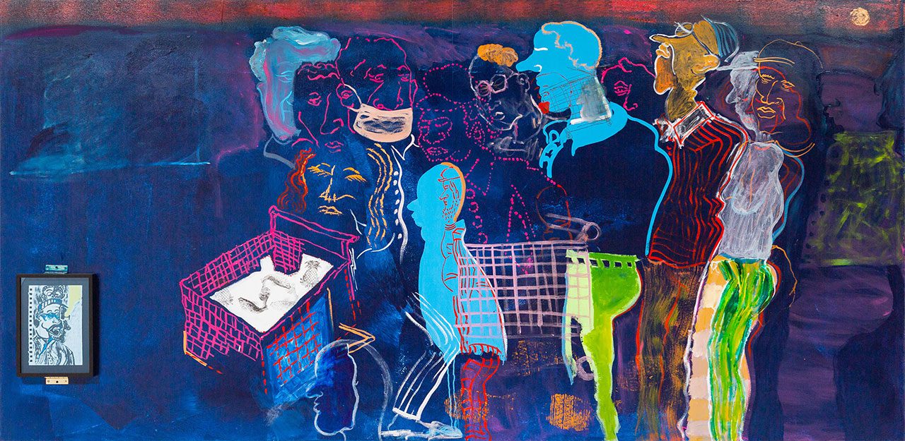 Walter Price isn’t afraid of color. Instead, he sees freedom and joy in its endless possibilities. One glimpse at his exuberant canvases, which burst with lush, vivid hues, make this perspective abundantly clear. In his solo exhibition “Pearl Lines” he presents 25 paintings which blur the boundaries between figuration and abstraction and draw viewers into his singular visual world. Titled “Walter Price: Pearl Lines”, the exhibition represents the most in-depth museum exploration of the artist’s practice to-date, and features selections from significant bodies of work produced between 2017 and 2023, including a painting acquired by the Walker Art Center in 2020 that is on public display for the first time. Price began his journey to art in the U.S. Navy. Like generations of artists before him, Price’s military service allowed him to pursue an arts education through the G.I. Bill. Practicing his skills in his Brooklyn studio where he relocated in 2013, Price focused on interior spaces depicted at a small scale, which have continued to serve as a platform for his wide-ranging formal and conceptual explorations. His fluid compositions feature everyday objects, figures, and domestic motifs emerging from and obstructed by rich swaths of color, tangles of lines, and abstract marks and symbols. This distinct fusion of figuration and abstraction gives his work the aura of a surreal dreamscape, both familiar and foreign. The open-endedness of his visual language is precisely the point, as he creates the framework for viewers to complete the narrative possibilities from their own experiences and viewpoints. This sensibility also manifests in his many drawings, which he creates as studies for his paintings and as discrete works for art. While the exhibition does not include any examples of his works on paper, this aspect of his practice is also invoked in the exhibition its title, alluding to the beauty of drawing and its importance to his artistic vision. The same exhibition title has been used by Price for the majority of his solo exhibitions since 2016. It points to the continuity between his paintings and drawings, which he often creates as ongoing series with subtle formal and conceptual variations between the featured works, as well as to the repetitive, ritualistic qualities of his practice. Price’s work also often engages with history, race, and cultural consciousness. Many of his paintings reference socio-political and cultural happenings—past and present—while also denying the viewer any clear articulation of particular events. In this way, Price rejects simple representation in favor of a more complex network of evocations that communicate both tangible experience and broader emotional and sensorial expressions. His work is at once specific and open-ended; representational and abstract; individual and communal. This approach builds on the legacies of such artists as Henry Taylor and Jacob Lawrence, and also gives Price the freedom to pursue formal experimentation. It also reflects how Price sees himself as an artist: a painter first and foremost, exploring the possibilities of paint and painting. This is an important facet of his vision, which pushes against a common notion that Black artists should focus on narrating or expressing the Black experience. The exhibition includes a broad spectrum of works, capturing Price’s prolific practice. Among the works are a selection of smaller-scale paintings, produced in 2020, including “Hold the umbrella tight while viewing my rain”, “They don’t LOVE you” and “So much intellectual work to remain wrong”. The works were made, in part, during a residency at Camden Art Center and represent a rare engagement with the color white, which creates a rhythmic throughline across the paintings. These works also highlight Price’s ability to work at a smaller scale without losing the potency of his visual vocabulary and formal style. The exhibition also includes works produced at a monumental scale, such as “Global Outcry” (2018-2020) and “It got uncomfortable, immediately!” (2022), among numerous others. Both paintings emerged from darker imagery, including the perils of fake news cycles in the former and the greed elicited by pandemic in the latter. In each instance, Price used the subjects to engage in a painterly exploration of color, line, and form to work through these ideas and the sensations that they evoke. The ehibition also includes “Step into the Spotlight” (2018), a painting from the Walker’s collection that is shown for the first time alongside “Earth mother” (2018) and “Pleasure the false God” (2018). Price began this series of paintings when he was experimenting with transitioning from smaller to larger formats, seeking to infuse elements from his smaller compositions into pieces centered around a single figure. The creation of the works also coincided with a media controversy stemming from comparisons between US tennis icon Serena Williams and a male counterpart. Perplexed by society’s tendency to equate femininity with weakness, Price was inspired to create this series of large-scale paintings reminiscent of statues and sports trophies. The series, featuring figures suggestive of running, marching, or poised to leap out of the canvas, was meticulously constructed from the bottom-up, deliberately distorting perspectives to approach figuration through painterly abstraction.