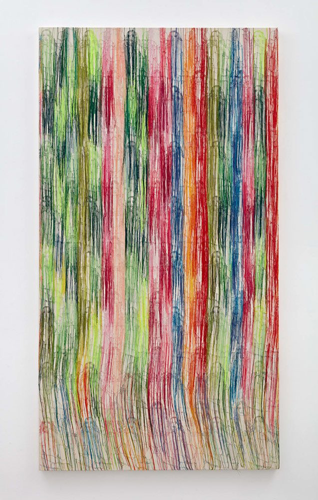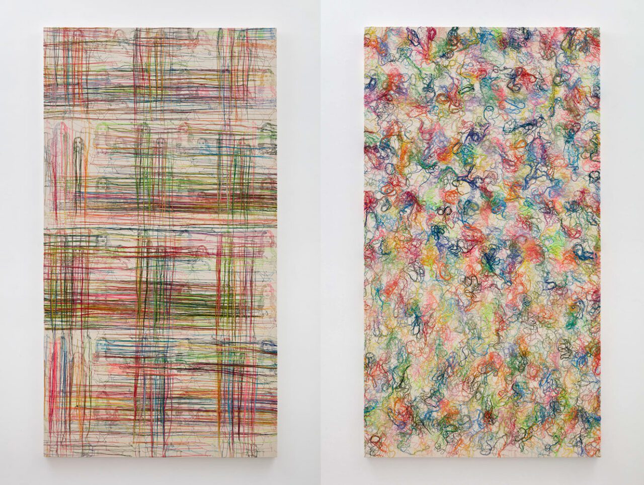 Right: Ghada Amer, THE LILLY PUDDLE, 2025, Embroidery and gel medium on canvas, 88 x 48 inches, 223.5 x 121.9 cm, © Ghada Amer, Courtesy the artist and Marianne Boesky Gallery