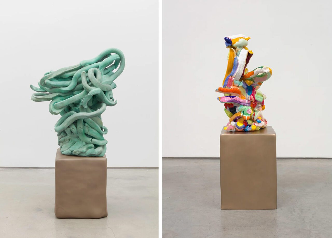 Right: Ghada Amer, COLORED THOUGHTS, 2023, Bronze, 44 x 17 x 15 1/2 inches, 111.8 x 43.2 x 39.4 cm, © Ghada Amer, Courtesy the artist and Marianne Boesky Gallery