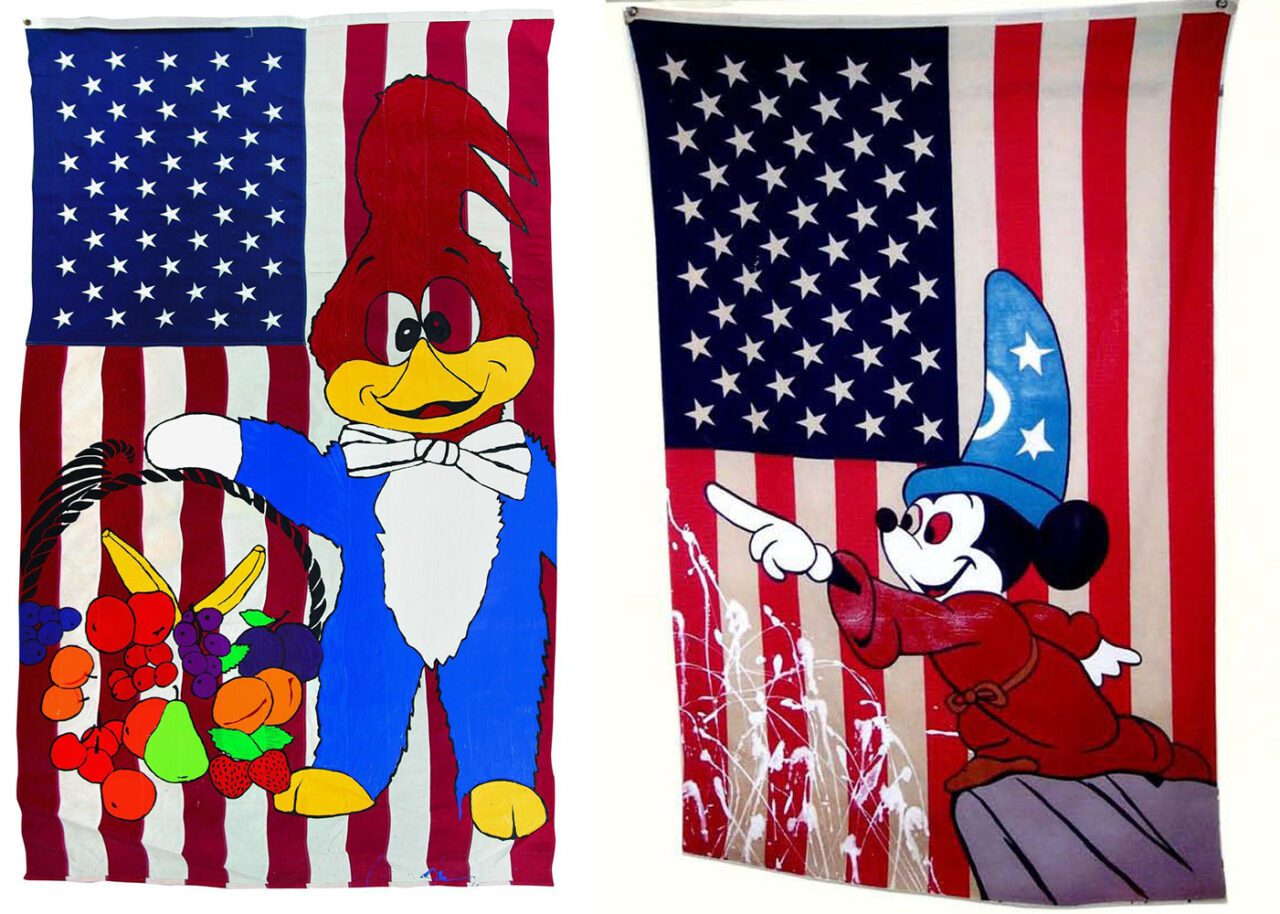 Right: Ronnie Cutrone, Sorcerer’s Apprentice – Dancing Waters, 1985, Oil on U.S. Flag, Courtesy Galerie Gmurzynska