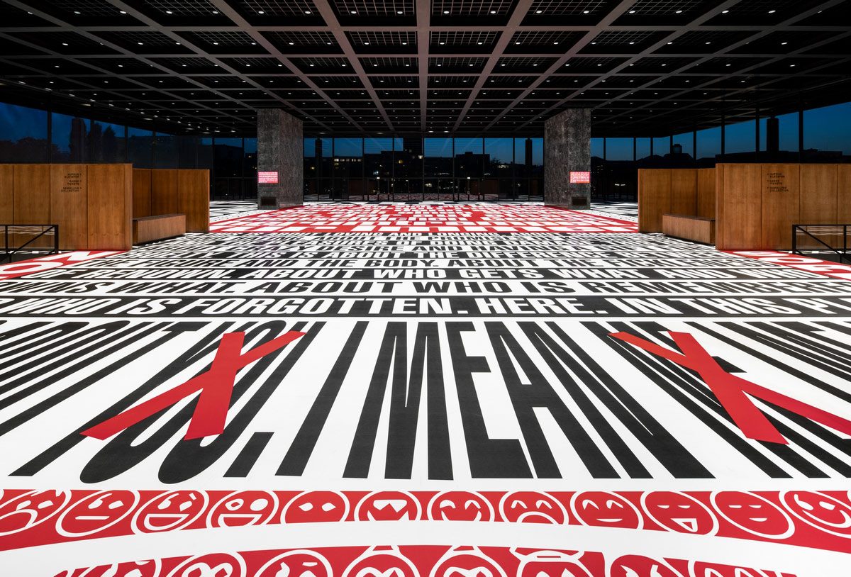 Photo: Barbara Kruger, Bitte lachen / Please cry, Installation view, Neue Nationalgalerie, Berlin, April 29– August 28, 2022, Courtesy the artist and Sprüth Magers / Mies van der Rohe, VG Bild-Kunst, Bonn 2022, Photo: Timo Ohler