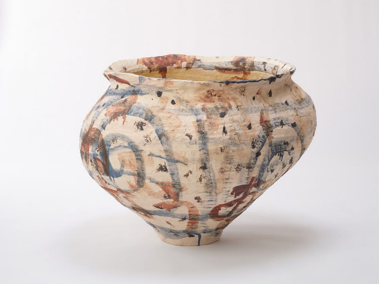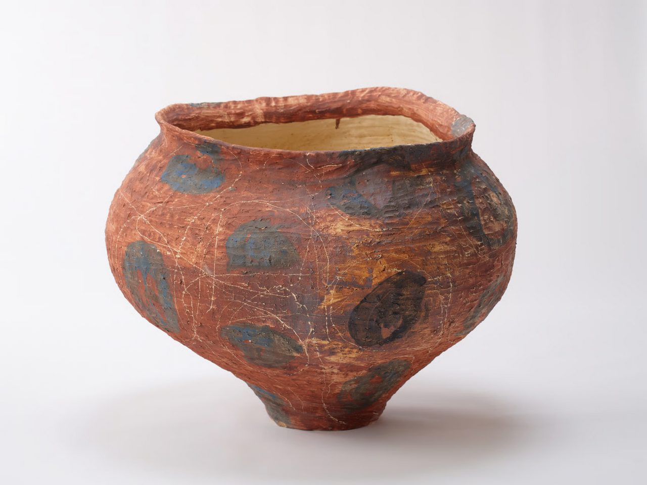 Kazunori Hamana was born in Osaka, Japan, in 1969 and grew up in Amagasaki, Hyogo Prefecture. Since his childhood, he has been driven to pursue a deep philosophical interest in the nature of how the universe functions on micro and macro levels. This awareness of impermanence and the transience of earthly things has guided his work and lifestyle. In this vein, Hamana left his home at the age of fifteen to stay with farmers in rural Hyogo Prefecture, working the land and caring for the livestock at a nearby agricultural school. After a period of studying in Humboldt County and San Diego, CA as a college student embedded in a hippie milieu, the artist found himself drawn back to his home country and his Japanese identity. He later settled in a rural fishing village in Japan’s Chiba Prefecture, where he currently divides his time between working as an organic rice farmer, a fisherman, and an artist. Hamana draws upon the ancient traditions of Japanese ceramics while cultivating new, inventive techniques in shaping, glazing, coloring, and firing. He makes large and delicate vessels out of natural clay sourced from Shiga Prefecture in Japan. Inspired by traditional Japanese tsubo, functional clay jars dating back to prehistoric times, he creates each sculpture by hand, making use of improvisation and experimentation. A self-taught ceramicist, Hamana incorporates a slow and gradual process, echoing the rhythm of his daily life in his rural surroundings. He considers these daily chores as paramount to his sustainable practice and his pursuit of truth. After the pots are fired, he places them outside of his studio, where they are left to accumulate impressions from the seasons changing. As these irregularly shaped objects continue their development on sun-drenched balconies washed over by the sea waves, in shady bamboo groves, or in his garden facing the mountain and his rice fields, the natural environment directs their transformation. Hamana’s earthenware provides a contemporary look at Japan’s rich, long history of pottery, from ancient terra-cotta burial figures to everyday domestic objects. With surfaces sometimes fissured and peeling like parched earth, Hamana’s sculptures appear in various colors ranging from bone-white to smoky blue-grays; some featuring geometric and organic forms, stripes, symbols, and language. Channeling tradition through a contemporary lens, Hamana references human history and art history, including the practices of Cy Twombly, Alberto Giacometti, Isamu Noguchi, and Jackson Pollock—the result is a body of work imbued with the beauty of imperfection and the ephemeral. Kazunori Hamana’s vessels, hand-built by coiling extruded strands of ash gray clay, carry the imprint of the artist’s palms and fingers throughout their physicality and brushed glazing. Robust and sizable, these rotund basins team with the minute details imparted upon them by human entropy and the circumstances of their making. Similarly examining the sublime implications of cultivated chance, Ueda aligns himself with the Shigaraki ceramic tradition of beautiful imperfections. Using a layer of plaster atop clay, the shells of Ueda’s vessels are built to crack and peel away revealing oozing, vivid glaze and cast forms that have been used in Japan since the Edo period.