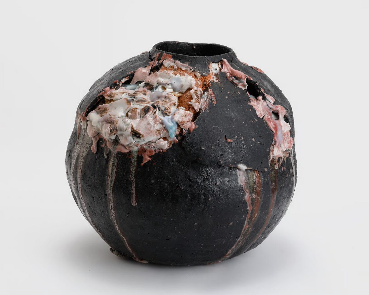 Frozen in the very midst of their own formation, Yuji Ueda’s ceramic vessels capture a vibrant kinetic energy—finished in electrifying colors and posed as though they might rupture. Sandy layers of ceramic flake and curl to reveal entirely different clay bodies emanating from their crevices, as if these works were the physical embodiment of the process of ceramic-making itself. Large peeling vessels, molting orbs, and dripping ceramic-bronzes come together to create a futuristic object landscape. The artist’s glazes flow off the vessels, cascading out toward the viewer or wilting toward the ground. To achieve this explosive effect, Ueda prepares layer upon layer of clay and different glazes, as though building the tiers of a cake. Ueda’s clay for these forms is sourced from his native Shigaraki or its neighbor Iga. The soil from these areas, one of the oldest pottery-producing regions in Japan, typically contains feldspar: an abundant rock-forming mineral that melts and swells during the firing process. Ueda will also add feldspar to natural clay or glazing to create his desired effect. Ueda’s round and off-kilter ceramic vessels are made through a casting process that utilizes a plaster mold. This method, which produces these recurrent warped-orb shapes, innovates on the slightly askew configurations of traditional Shigaraki wares, which were celebrated for their beautiful imperfections. Since the late 1300s, Shigaraki pottery has been popular for use during tea ceremonies among tea masters and cultural tastemakers. These globular vessels are comprised of three different kinds of clay, causing them to molt and crack, ultimately hyperbolizing the visual language of poetic flaws found in the history of Shigaraki ceramics. Ueda’s forms are seemingly expressive, but retain technical and historical significance. The unique abstractions that the artist constructs from clay build upon the rich history of Shigaraki vessels and take this tradition to its natural conclusion with their experimental forms and explosive and dynamic glazes. These works give off the illusion of bubbling outwards or collapsing inwards, emphasizing the beauty in that which is flawed.