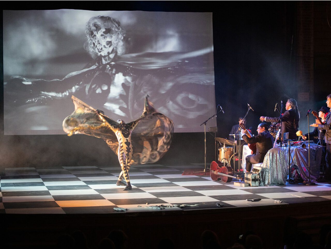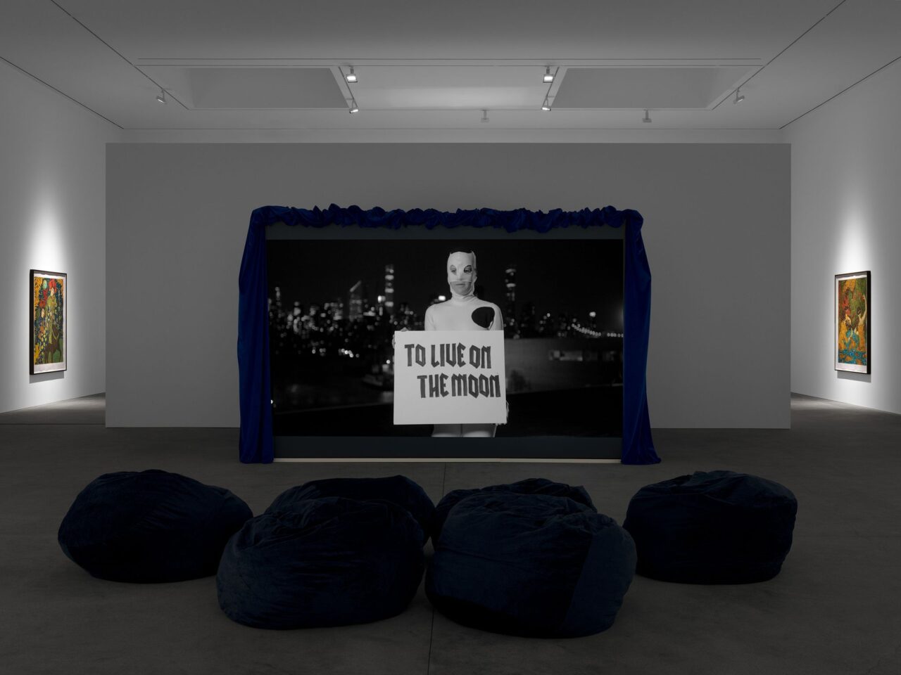 In his solo exhibition “Empress of Night”, Marcel Dzama conjures a dreamlike realm teeming with fantastical visions—a world at once lush and precariously flooded, where anthropomorphized creatures and ethereal, dancing figures move through tangled junglescapes and beneath vast, atmospheric skies. These intricate compositions are rich with references to Spanish painter Francisco Goya and the surrealist poet Federico García Lorca, one of the most celebrated literary voices of 20th-century Spain. Through these historical echoes, Dzama draws a resonant line between the violent, uncertain periods those artists endured and the tumultuous sociopolitical and ecological crises of our present era. Some of Dzama’s works confront the rise of authoritarianism head-on, while others deploy allegory to critique the escalating threats to democracy and civil liberties around the globe. Crafted during the late hours of the night—true to the artist’s nocturnal habits—many of these pieces unfold beneath starlit skies and celestial bodies. These luminous nightscapes, despite their darkness, radiate a sense of enchantment and resilience, offering glimpses of hope amid chaos. A highlight of the exhibition is Dzama’s 2023 film “To Live on the Moon (For Lorca)”, commissioned by Performa for its most recent performance biennial in New York. The film opens with a stylized reenactment of Lorca’s assassination by Nationalist forces during the Spanish Civil War in 1936—an event that silenced one of Spain’s most vital creative voices. The work draws inspiration from Lorca’s own surrealist screenplay “Trip to the Moon”, written in 1929 but never produced. Comprising 73 fragmented vignettes laced with love, violence, and mysticism, Lorca’s screenplay is considered a landmark of surrealist literature. Dzama’s film pays homage by blending fantastical imagery and dreamlike figures with references to early cinema—particularly Georges Méliès’s iconic “A Trip to the Moon” (1902)—to explore themes of mortality, memory, and transcendence. In the gallery, the film is projected on a grand scale within a specially designed viewing environment. Midnight blue drapery and cushioned seating create a soft, immersive atmosphere, inviting viewers to settle in and absorb the film’s poetic rhythms. Around the projection space, a series of drawings—carefully spotlighted—extend the film’s tone into the physical space, amplifying its lyrical and hypnotic qualities. Among the exhibition’s new works are several ambitious large-format drawings teeming with life and layered symbolism. These images, overflowing with animals, plants, and mythic elements, act as meditations on the planet’s fragility and the interwoven fate of all living beings. One such piece, “The Sleep of Reason Produces Monsters” (2025), directly references Goya’s 1799 etching of the same title, reflecting on the dangers of ignoring rationality in favor of fear and chaos. “Blue Water Blues” (2024), a mesmerizing, nearly monochrome triptych, plunges viewers into an underwater world densely populated with marine creatures—an elegy for oceans under siege. Another standout is “I Never Came From Your Rib You Came From My Vagina” (2025), a vivid and jubilant celebration of womanhood that challenges the rise of toxic masculinity with bold iconography and unapologetic energy. This monumental triptych reads as both a personal and political declaration, reaffirming the generative power of the feminine in the face of reactionary cultural currents. With this exhibition Dzama has constructed a richly symbolic, visually opulent universe that is as urgent as it is enchanting—a space where myth and memory collide, and where the darkness of night becomes a canvas for both resistance and rebirth.