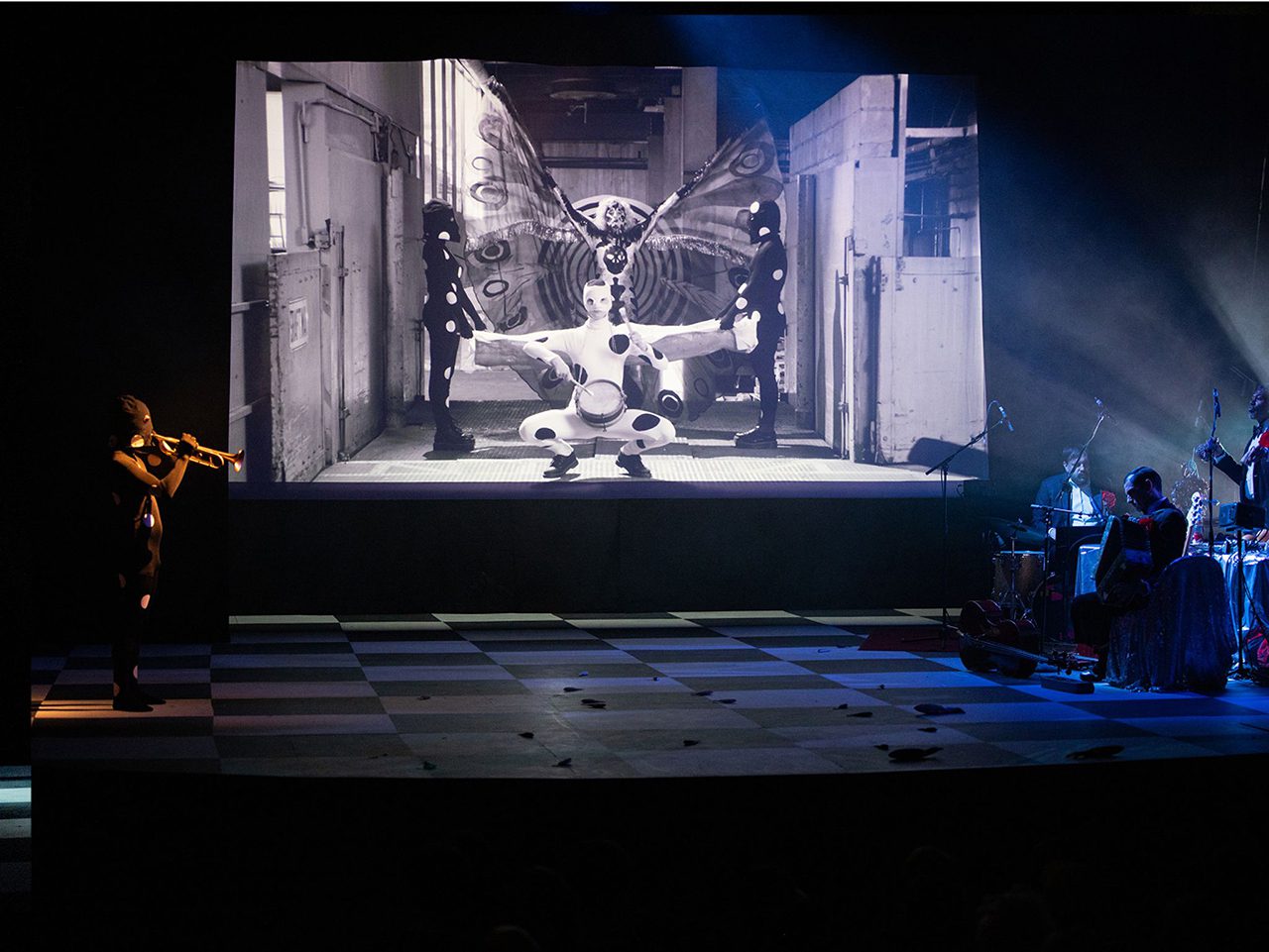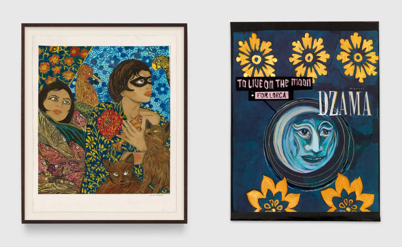 Right: Marcel Dzama, To live on the moon, 2023/2025, Pearlescent acrylic ink, watercolor, graphite, Polaroids, and collage on paper in twenty-three (23) parts, Each: 11 1/2 x 8 1/2 inches (29.2 x 21.6 cm), Signed, titled, and dated, © Marcel Dzama, Courtesy the artist and David Zwirner Gallery
