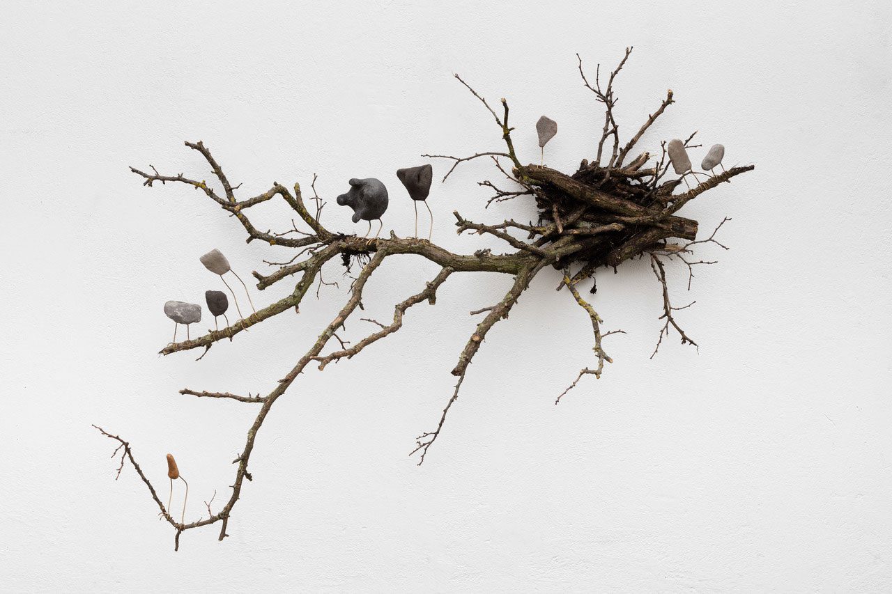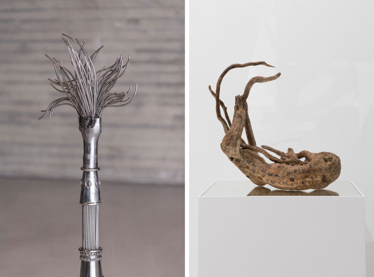 Right: Charwei Tsai, Driftwood Mantra, 2020, Ink on driftwood, on a mirror, 39 x 60 x 30 cm (sculpture), 55 x 35 x 80 cm (plinth with mirror plate), TBA21 Thyssen-Bornemisza Art Contemporary Collection, Photo: Roberto Ruiz | courtesy the artist and mor charpentier, Paris