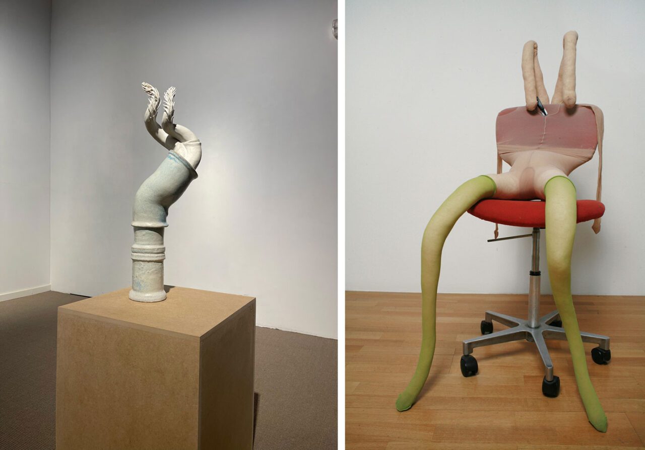 Right: Sarah Lucas, Bunny Gets Snookered #3, 1997, Tan tights, green stockings, red office chair, clamp, kapok, wire, 120 x 58 x 60 cm, TBA21 Thyssen-Bornemisza Art Contemporary Collection. Installation view: THIS IS NOT FOR YOU. Sculptural Discourses, Thyssen-Bornemisza Art Contemporary, Vienna, Austria, 2006-2007, Photo: Michael Strasser | © Bildrecht, Vienna, (2025)
