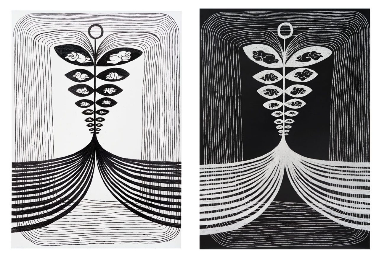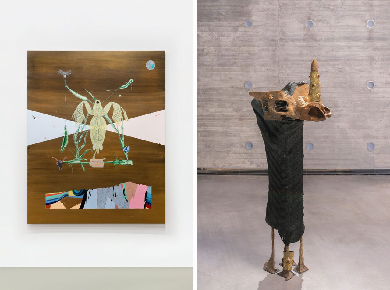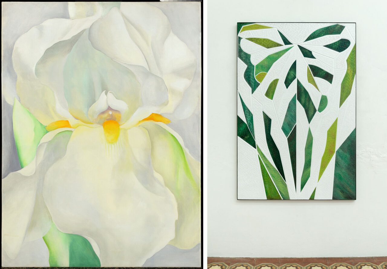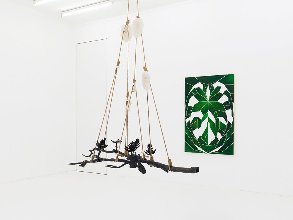 Right: Naufus Ramírez-Figueroa, Variación sobre hoja de Anturio # 7, 2023, Acrylic on carved wood panel with metal frame , 150 x 100 cm, TBA21 Thyssen-Bornemisza Art Contemporary Collection , Photo: Margo Porres | Courtesy the Artist and Proyectos Ultravioleta