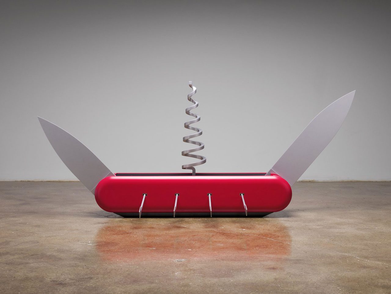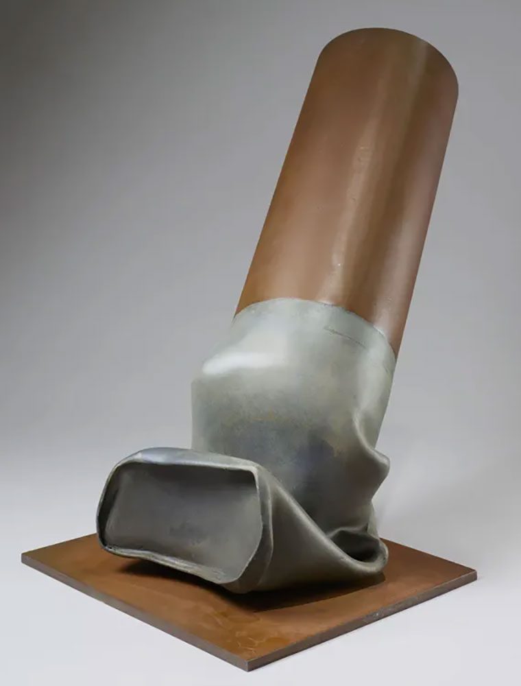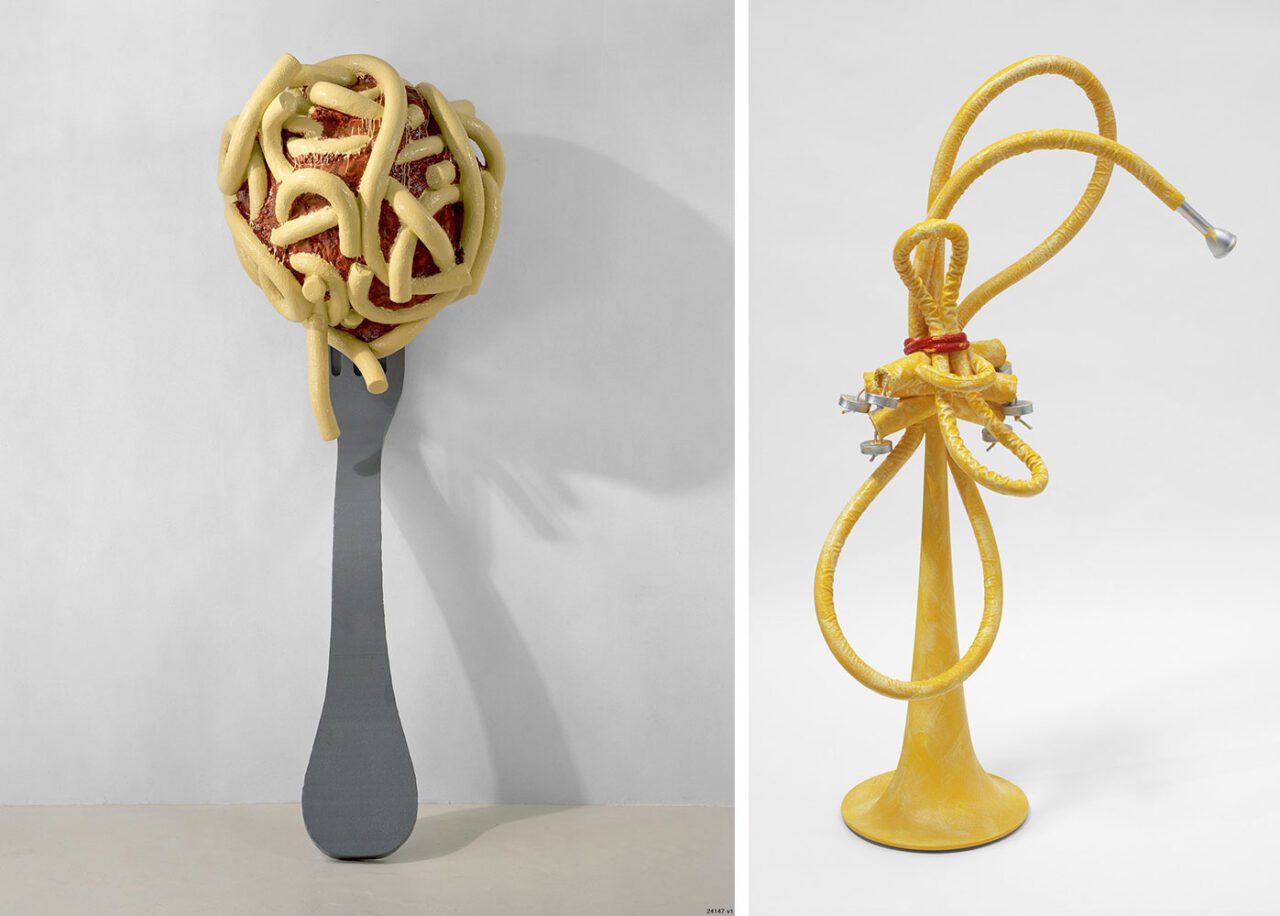 Right: Claes Oldenburg and Coosje van Bruggen, Tied Trumpet, 2004, aluminum, canvas, felt, polyurethane foam, rope, cord; coated with resin and painted with latex; plastic tubing, 50-1/2″ x 23-1/2″ x 15″ (128.3 cm x 59.7 cm x 38.1 cm), Edition of 3 + 1 AP © 2019 Claes Oldenburg and Coosje van Bruggen, Courtesy Pace Gallery