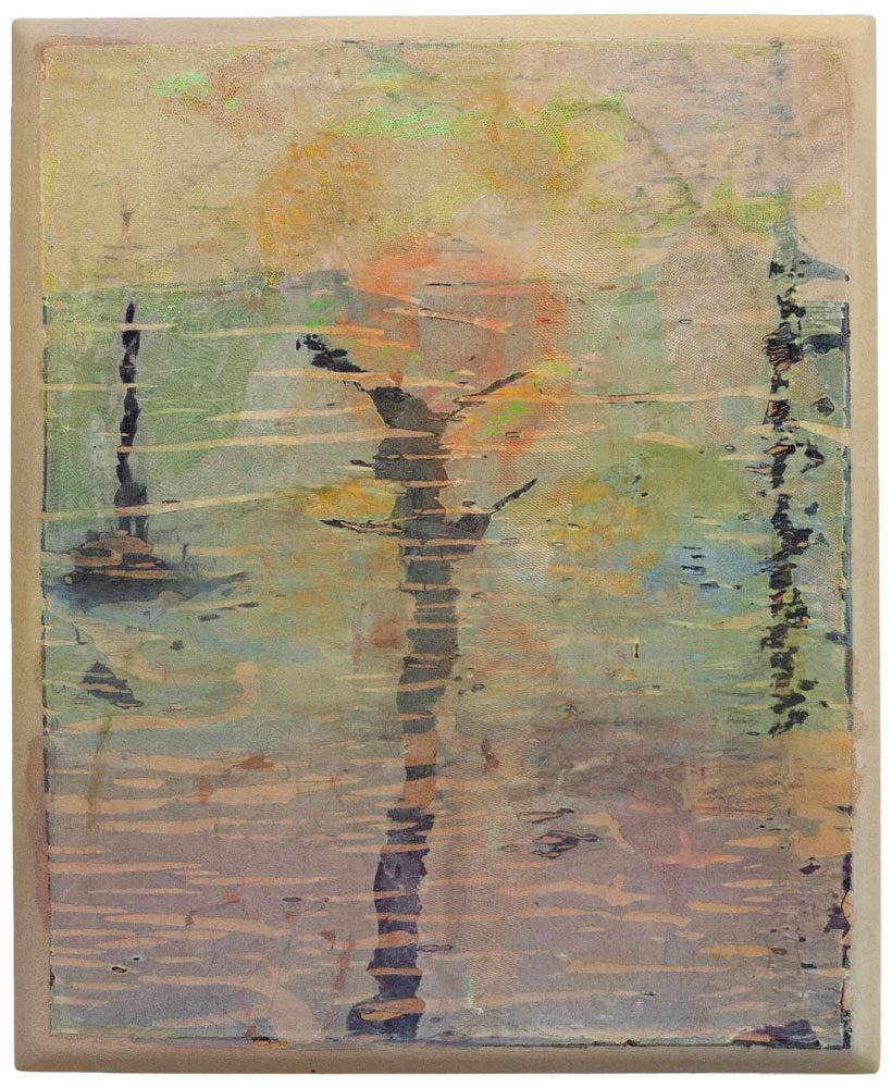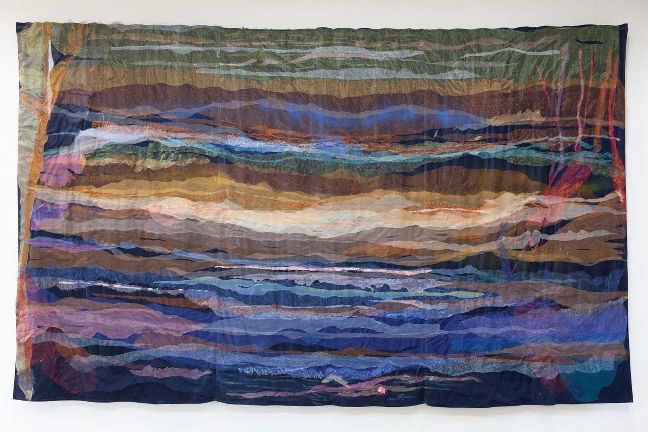 Petra Lindholm describes her imagery as a flowing sequence of landscapes shaped by memory, the subconscious, and deeply personal experiences. Her solo exhibition “Songs of Trees” presents a series of textile works that explore how place-based encounters and intuitive perception can be translated into visual form. Drawing on the tactile and temporal qualities of textile—its slow processes, bodily proximity, and inherent intimacy—Lindholm seeks to convey the emotional atmospheres and subtle moods that emerge in dialogue with the living landscape. The exhibition includes an array of works ranging from large-scale tapestries and free-hanging textile collages to smaller, painterly pieces. These compositions blur the boundaries between craft and fine art, combining meticulous technique with an openness to chance. A central work in the exhibition, “Timelines” (2025), takes the architecture of the gallery itself as its point of departure. Composed of multiple layers of sheer fabrics, applied both by hand and sewing machine, the piece reflects Lindholm’s embrace of spontaneity. The landscape unfolds gradually, layer by layer, through a process guided as much by intuition as by intention. In this recent body of work, Lindholm turns inward, stepping away from the rapid stream of contemporary life to find a slower rhythm in the quiet presence of nature. Her focus rests on trees—ancient, rooted beings that offer an alternative experience of time through their silence and stillness. Approaching them with attentiveness and reverence, she allows these encounters to guide the creation of each work, letting the trees themselves become silent collaborators in her artistic process.