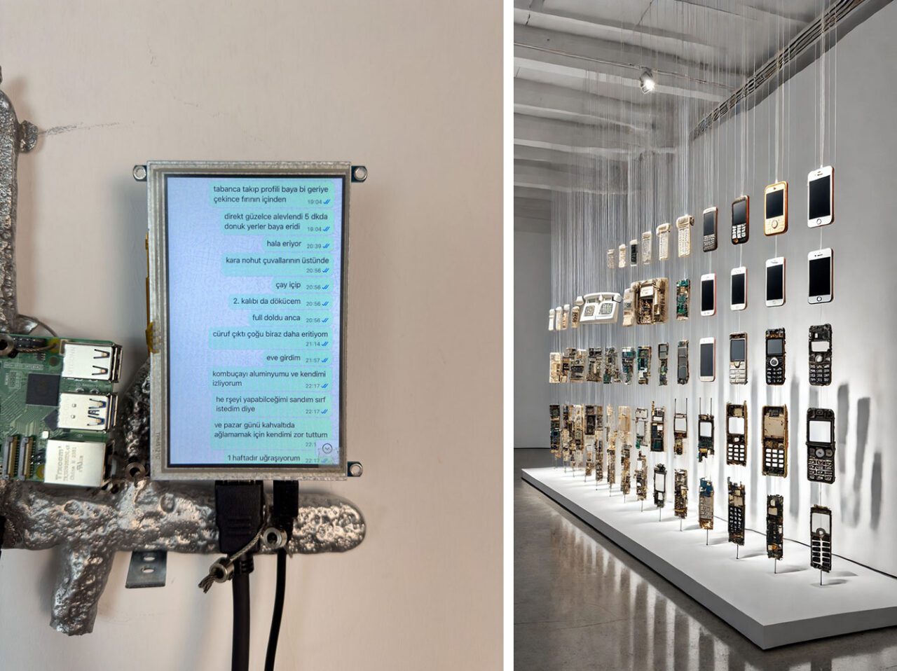 Focusing on the impact of digital technologies on our perception of memory, time, and space, Şahsenem Altıparmak explores the temporal continuity of both personal and collective memory. Working across video and interactive media, she brings together archival objects, digital data, and technological devices to construct alternative con- texts around the themes of resistance and transformation between past and future. “Memory of Network” is an installation composed of mobile phones, probing the mem- ory of the digital age. Once-functional devices from different periods are presented as carriers of personal memory, witnesses of technological evolution, and overlooked archival artifacts on the verge of disappearance. Positioned as objects that carry material and temporal tension, these phones also hold potential traces of deleted messages and unrecorded images. Rather than being randomly placed, the devices are dispersed throughout the space with a deliberate rhythm and structure. The viewer is not merely encountering a graveyard of obsolete hardware, but step- ping into a space that reflects collective forgetting, digital residue, and the shifting nature of communication itself. By quietly inhabiting the exhibition space, Memory of Network renders visible the personal pasts held within devices rapidly consumed by digitization.