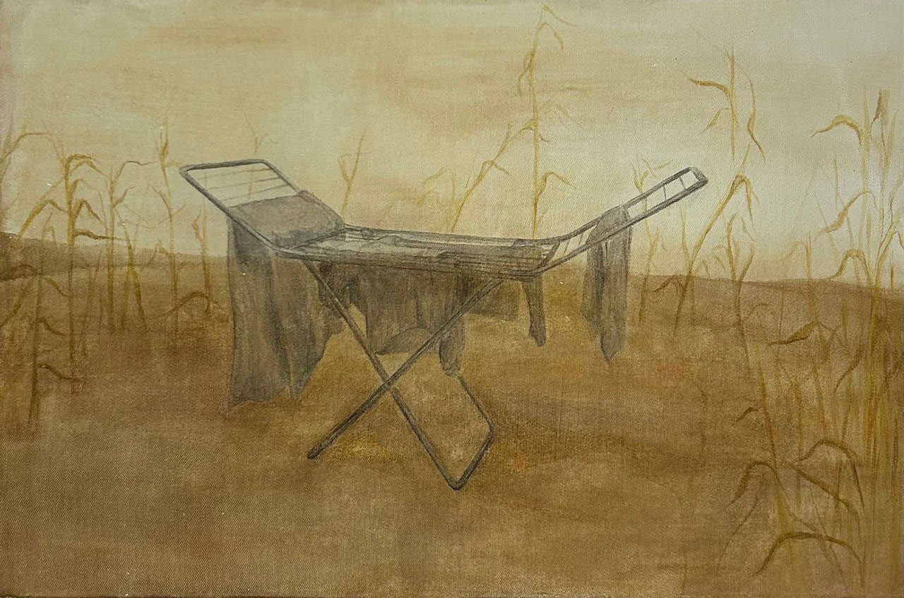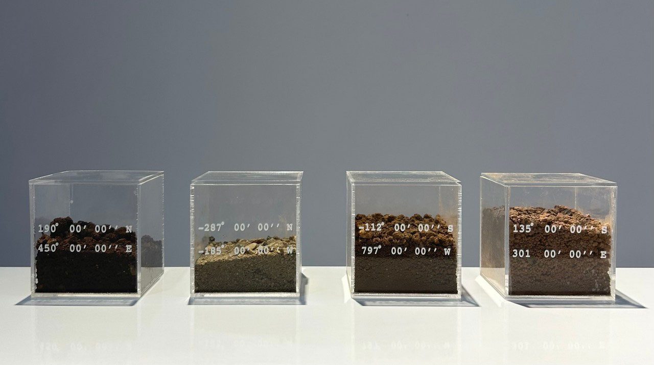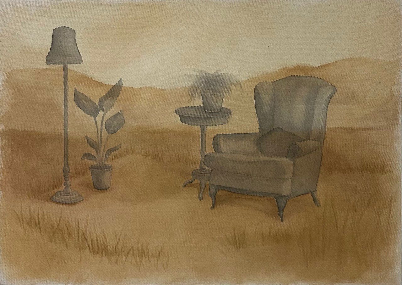 Yeşim Özkan pursues ideas centered around belonging and cultural memory. By questioning the relationship between identity, memory, and place, she focuses on how individuals relate to social and geographical contexts. Themes of migration and displacement form the core of her practice. She aims to express a sense of trans-ter- ritorial belonging through imagery. The “Lost Timeline” series takes inspiration from a map mentioned in geologist Marcia Bjornerud’s book Timefulness. In this map, while different regions of the world are as- signed to time zones, some areas are marked in gray. These gray zones represent land that belongs to no state and thus fall outside any time zone, existing as unclaimed territories. Through painting and installation, the series interrogates this state of state- lessness. The paintings imagine an alternative home composed of belongings that have lost their identity alongside these gray zones, where displaced objects trans- form into heimatlos items. The gray areas beyond time and place are approached not merely as voids, but as potential modes of existence. Meanwhile, the box installations contain soil collected from various geographies, inscribed with coordinates whose minutes and seconds are reset to zero, marking no specific place on earth. Thus, the soil is stripped of its cultural burdens and becomes undefined and timeless.