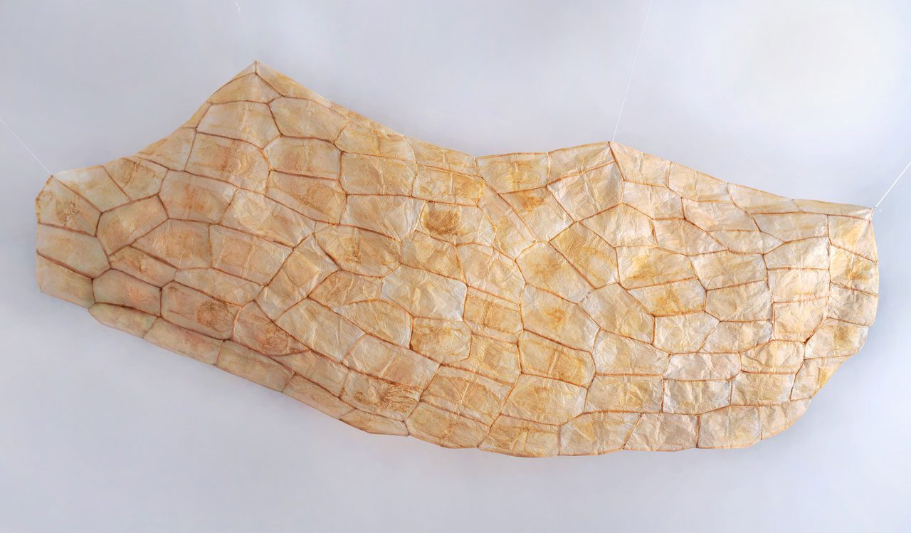 Ezgi Lemur centers her practice on the concept of the body through various disciplines such as photography, video, collage, and sculpture. Positioned at the intersection of visual arts and movement-based research, she examines the body as a dynamic field of perception. Challenging perceptual hierarchies and traditional dichotomies that separate mind from body, spirit from matter, and appearance from essence, she proposes a return to the material itself. Seeking new wholes and meanings emerging from the interaction of images and objects, Lemur aims to create fresh dialogic spaces on body representations and perception. Framing the body as a living site continuously woven by memory and senses, Lemur’s “Untitled” installation centers on tea – a beverage symbolically consumed across diverse cultures to gather and connect. Associated with respect and ritual during its preparation, she treats tea as a representation of skin. Through the disposable ma- terial of used tea bags, the work critically reflects on modern consumer culture. In a contemporary world where experience is reduced to consumption and comfort and convenience prevail, it points to an individualistic and isolated culture. With a fabric sewn from tea bag waste and its fragments, Lemur constructs a sustainable whole. The skin, linked to themes of identity and fragility, records history through its marks, and each piece of the fabric becomes a remnant of personal experience, joining a collective memory.