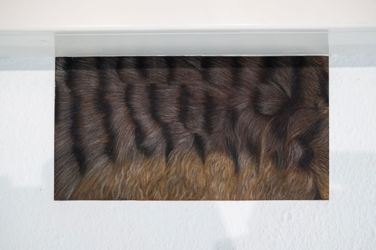 Begüm Yıldırım focuses on exploring relationships between self, body, environment, and mood, investigating non-hierarchical forms of interspecies relations from a post-humanist perspective. While questioning how meaning is shaped through inter- actions between living beings and places, Yıldırım examines emotional states through fragmentation, repetition, and tactile surfaces. The “Sensory Bond” is a triptych installation tracing care, intimacy, and sensory memory in interspecies relationships. Positioned in areas where a cat might be found, it invites viewers toward an intuitive and instinctive engagement. This mode of installation spatially extends the compassionate approach central to the work. Each stroke drawing a fur imitates the moment of stroking a cat, emerging from the artist’s effort to preserve this feeling in memory. Everyday interactions form the personal starting point of the series; these encounters encompass not only time spent with an animal but also leave traces of trust, ritual, and shared life within bodily memory. This perspective, which recognizes animals’ active agency, highlights the importance of mutual communication and meeting in shared intersectional spaces, inviting the viewer to bend down and observe attentively. Inspired by Donna Haraway’s concept of “significant otherness,” “The Sensory Bond” aims to reveal the relationality between humans and animals, emphasizing the personal and sensory dimensions of this bond, and making visible the ethical grounds of cohabitation.
