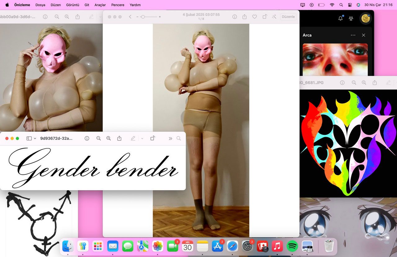 Şahmaran constructs their practice as a space of resistance against normative systems built upon gender. A driving force behind her work is the urge to expose the mechanisms of heterosexism, homophobia, transphobia, and broader societal pressures, particularly in how they assert control over bodies and identities in everyday life. They/them adopts a fluid approach that navigates the edges of the gender binary, aiming to erode fixed definitions both bodily and conceptually through transitions across the spectrum. The recurring figure of the “razor,” which first emerged in digital drawings and later materialized in canvas and ceramic forms, constitutes a sustained narrative within their practice. These images carry not only the trace of a wounded body but also the potential for healing and transformation. In her recent works, they/them increasingly emphasizes multiplicity over fixed identities, underlining the possibility of existing be- yond categorization. “Look at Me Between the Two Genders” is conceived as a critique of the binary structure of gender and opens space for modes of existence situated outside this rigid framework. At the center of the work lies the symbolic figure of the razor—a transitional form that fits nowhere and refuses containment. As a permeable presence at the center of the spectrum, it constantly shifts and morphs. Rather than depicting a linear narrative of growth or transformation, the trio of works gestures toward simultaneously coexisting states within a single body. Rooted in the proposition that “the world is bigger than two,” “Look at Me Between the Two Genders” invites the viewer to imagine ways of being that transcend fixed norms.