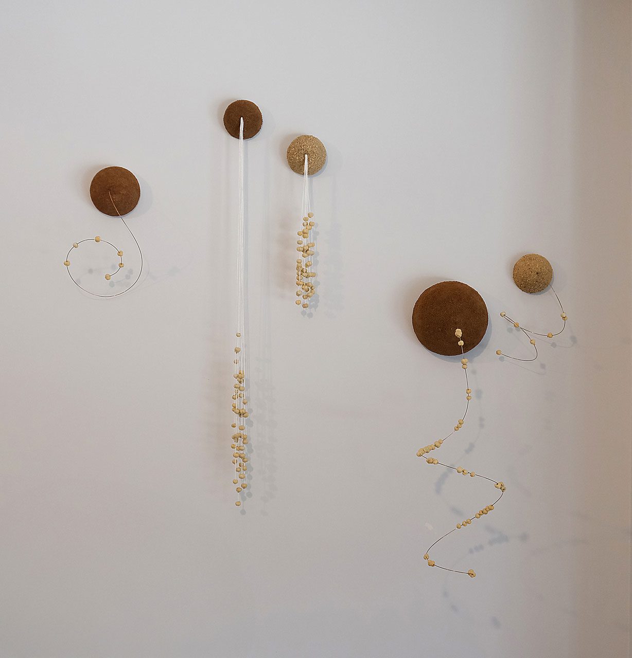 Anıl Önen builds her practice around rituals and daily habits that shape human be- havior. Within these structures, superstitions hold a central place; the artist examines these beliefs in their cultural and psychological contexts through dialogue and research, investigating invisible practices passed down through generations in collective memory. The installation “Kordoneli Koponaki Gipür Güpür Tül”, composed of seed, thread, and half-circle forms covered with rue herb, references a lace type of the same name and continues the plant’s teachings. Rue, which grows in Anatolia, is burned for protection against the evil eye or for cleansing purposes. Unlike other protective herbs, it belongs to the entheogen plant group. This plant contains psychoactive substances with hallucinogenic effects and allows people to experience past-connected memories. For this reason, it is called “grandmother” among plants in its group. Using rue herb as material, Önen presents a layered narrative as both a ritual object and in traditional and scientific contexts. The artist continues intuitive and experimen- tal research through the memory of the plant, positioning rue as a symbolic tool linking individual and collective memory. The forms in the installation evoke both a protective and nourishing transfer, like breast milk, and a bodily and spiritual bond to the past, similar to the umbilical cord.