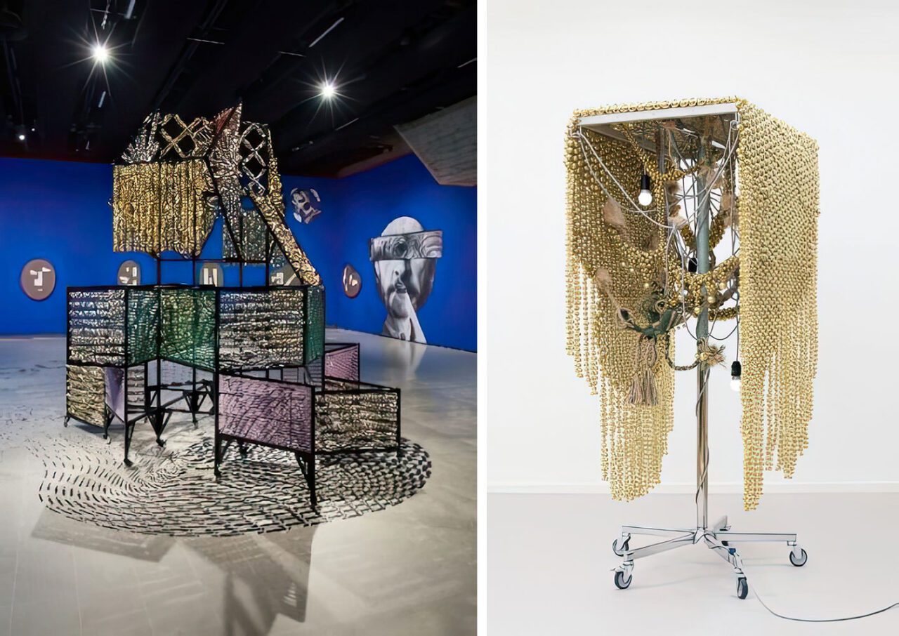 Right: Haegue Yang, Sonic Fabric over Brass Plated Web, 2015. Photo: Studio Haegue Yang, Clothing rack, metal grid, powder coating, brass plated bells, metal rings, light bulbs, cable, jute twine, cord, casters, 184 x 100 x 70 cm. © Haegue Yang, Courtesy the artist