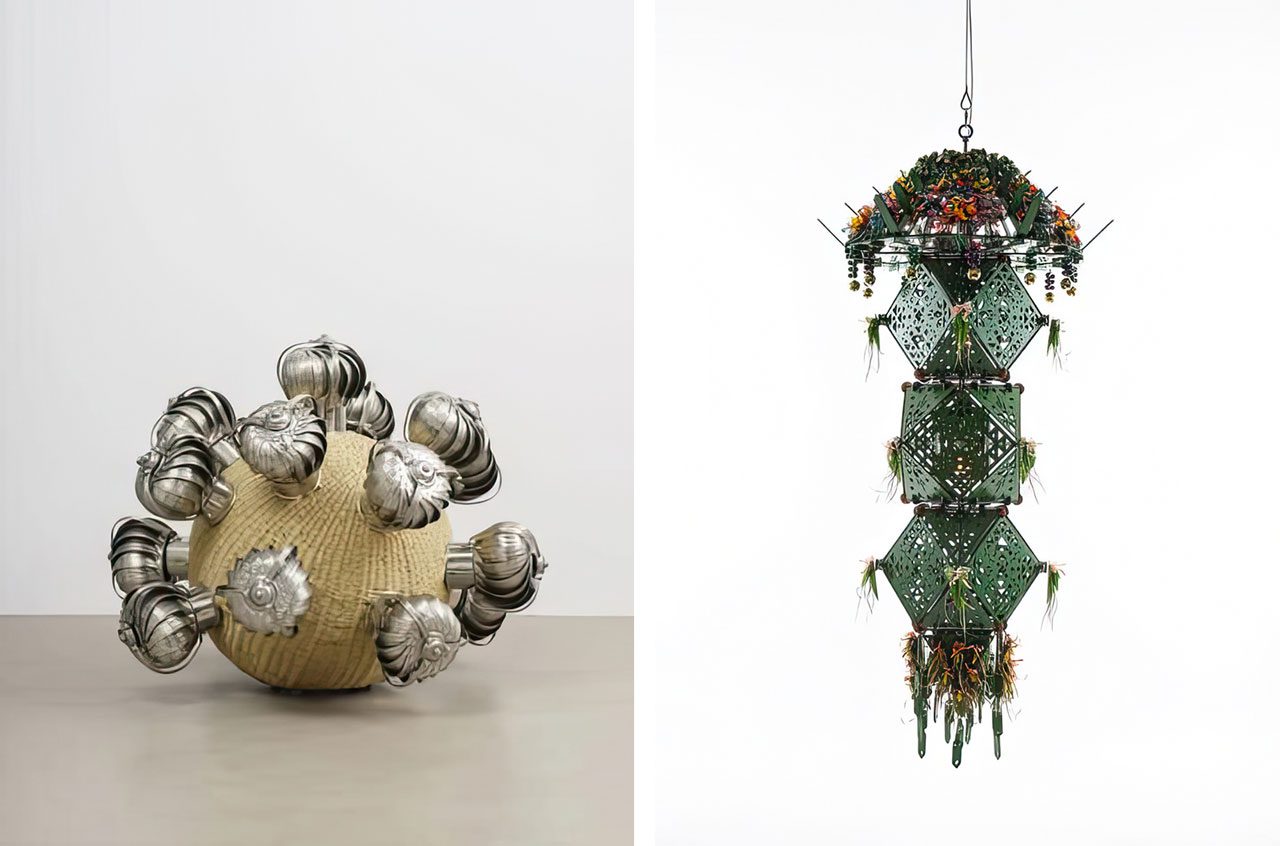 Right: Haegue Yang, Mesmerizing Votive Pagoda Lantern – Dusk Marsh Ultramundane Flowers, 2024. Photo: Studio Haegue Yang. Birch plywood, wood stain, PVD-coated fully threaded stainless steel bolt, PVD-coated stainless steel and stainless steel components, LED bulb, cable, hanji, washi, crepe paper, stainless steel wire rope, stainless steel chains, powder-coated stainless steel bells, PVD-coated stainless steel bells, split rings, gear motor, 153 x 75 x 75 cm. © Haegue Yang, Courtesy the artist and Kukje Gallery