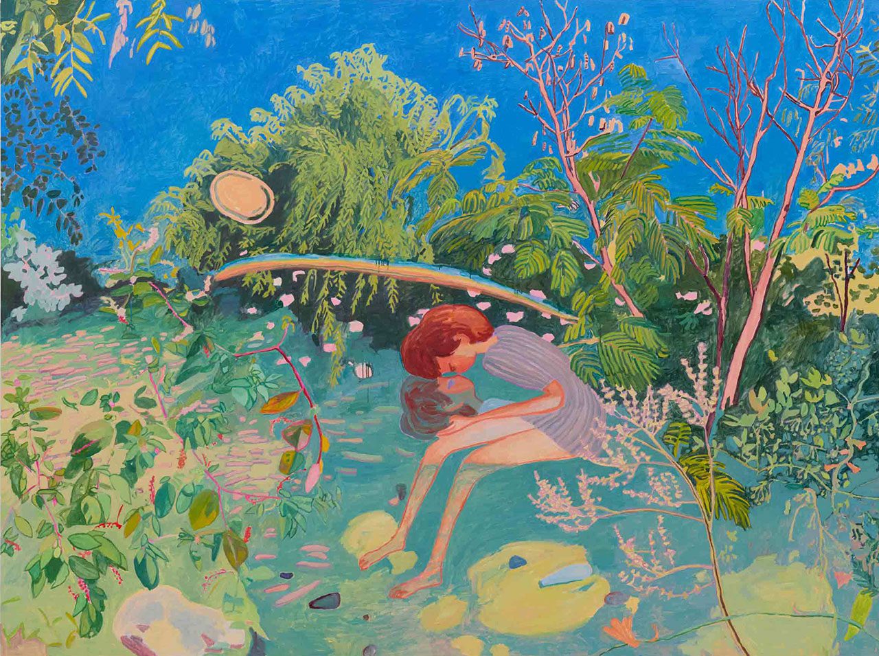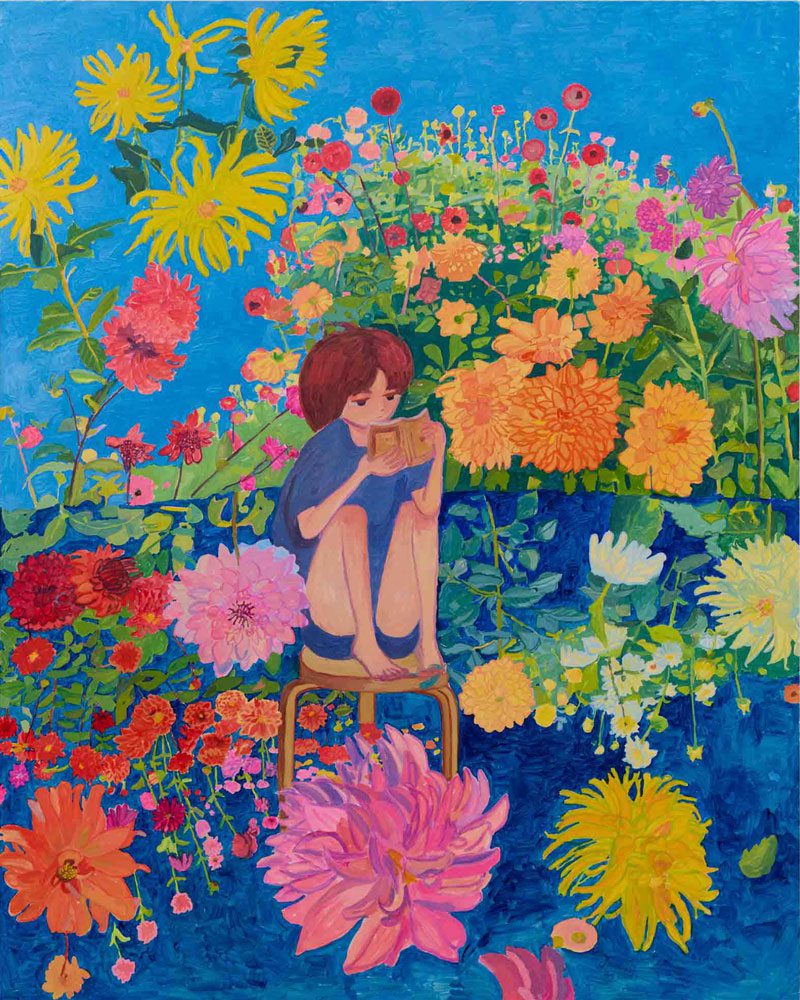 Makiko Kudo admits she is most often drawn to spring — a season of renewal, blossoming colors, and fleeting light — and her canvases, alive with vitality and subtle tensions, lean toward this season of beginnings. Unlike many painters who move between works, Kudo devotes herself entirely to a single large painting, usually completing it in seven to ten days. Her process is marked by a deliberate unevenness: some surfaces are touched lightly, washed in a single layer of paint, while others are worked over again and again, accumulating depth and density. This rhythm of contrast gives her paintings a breathing quality, animated by shifting intensities. In a 2022 conversation with Hans Ulrich Obrist, Kudo explained that she paints moments when “something I pass by suddenly appears to shine,” describing an instinctive process where impressions, moods, and memories collide to form images painted directly on canvas. Though she modestly calls her practice “depictions of what I see,” her works are better understood as reconstructions of mental landscapes, where fragments of her rural childhood intermingle with the environments she inhabits today. The layering of past and present, memory and reality, creates dreamlike terrains in which people are not separate from nature but woven into it, coexisting with water, plants, and sky in a fragile, equal balance. Her solo exhibition “Seeing With Myself” captures this vision in both paintings and drawings, each infused with a dialogue between perception and memory. The titular work depicts a figure staring into their reflection on the surface of water, a haunting double image that suggests the meeting of two selves — past and present, self and other. In “Day into Night, Night into Day”, Kudo translates the overwhelming vitality of the Machida Dahlia Gardens into a dual composition where day hovers above night, and a solitary figure reads quietly among exuberant blossoms. The work conjures shifting interpretations: coexistence of opposites, the blurring of time, and the desultory emotions of adolescence — sad yet joyful, luminous yet uncertain. Throughout, Kudo reveals how the same place, the same figure, can appear transformed by the passage of time or the angle of light. By weaving together landscapes and emotions, visible and invisible elements, and opposing states of being, her paintings bring the profound resonance of everyday life into sharp focus. They remind us that if we look closely, even ordinary moments can radiate with their own quiet brilliance.
