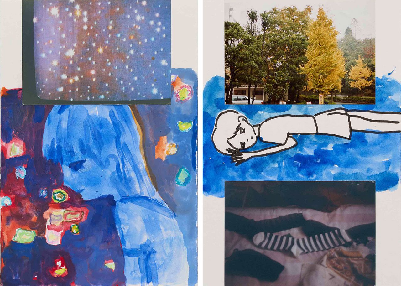 Right: Makiko Kudo, Ups and Downs, 2025, watercolor, marker pen, collage on paper, 24.2 x 16.6 cm , © Makiko Kudo, Courtesy the artist and Tomio Koyama Gallery
