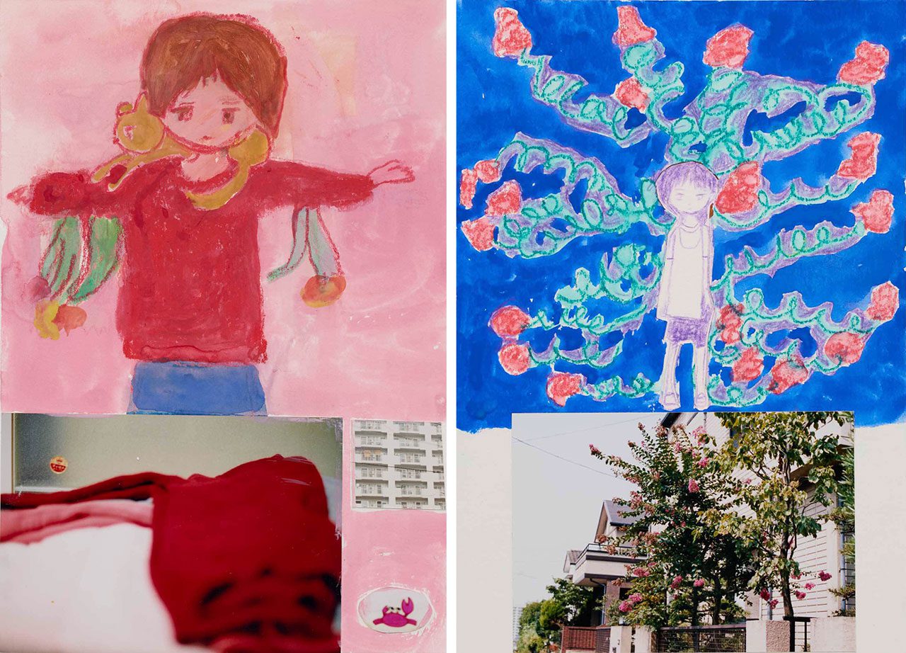 Right: Makiko Kudo, Buying a Red Sweater, 2025, watercolor, crayon, collage on paper, 24.2 x 16.7 cm, © Makiko Kudo, Courtesy the artist and Tomio Koyama Gallery