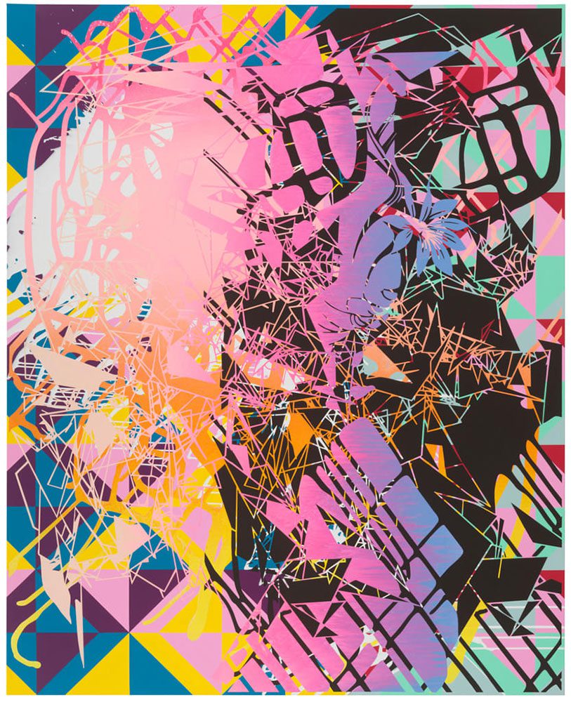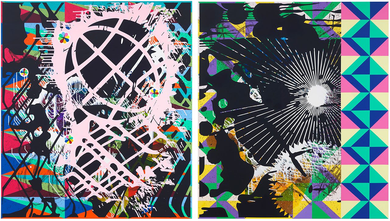 Right: Christine Streuli, Sonnenfinsternis_01, 2025, Acrylic and varnish on canvas, 160 x 140 cm (63 x 55 ⅛ in.), © Christine Streuli, Courtesy the artist and Galerie Peter Kilchman