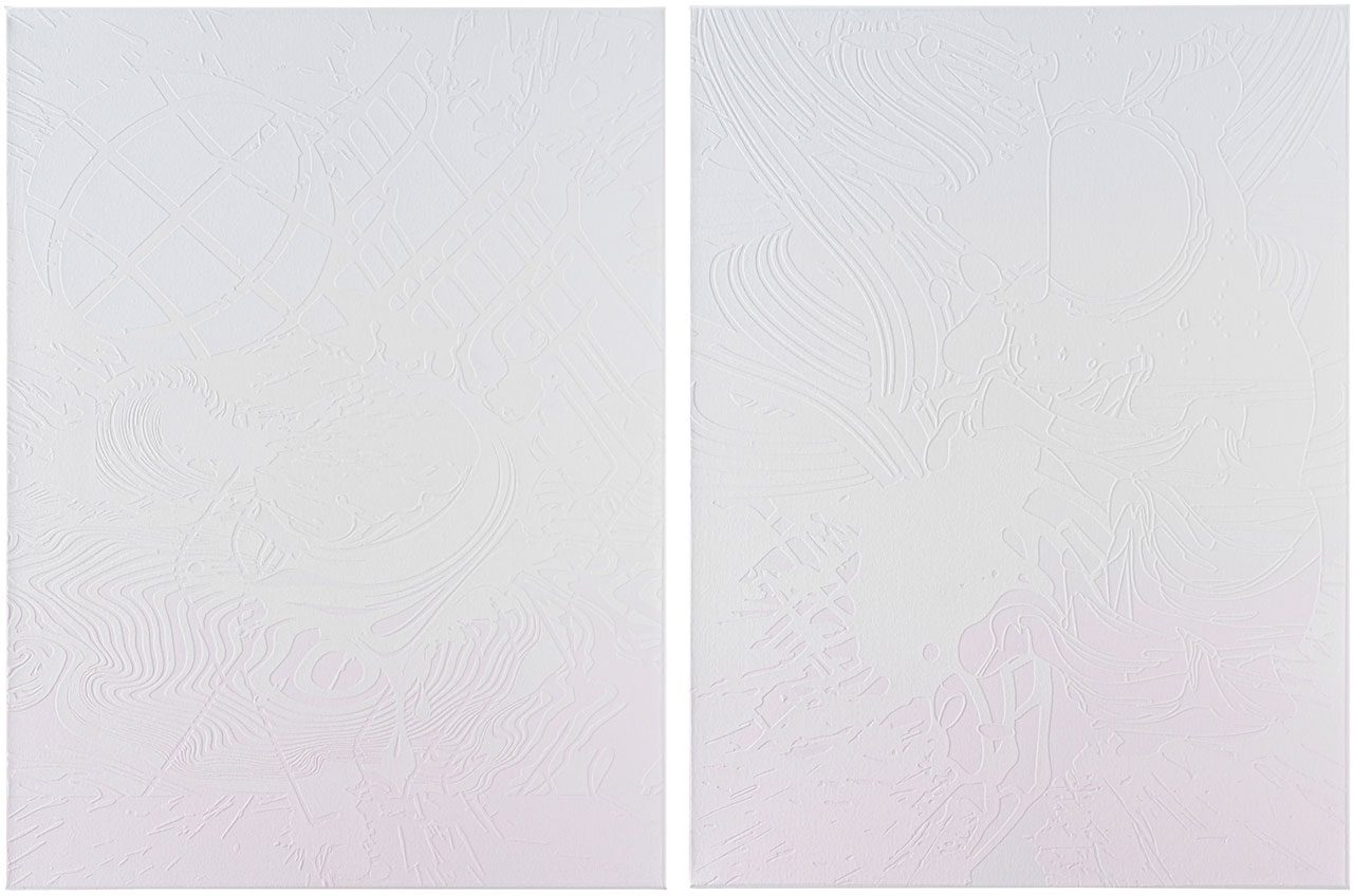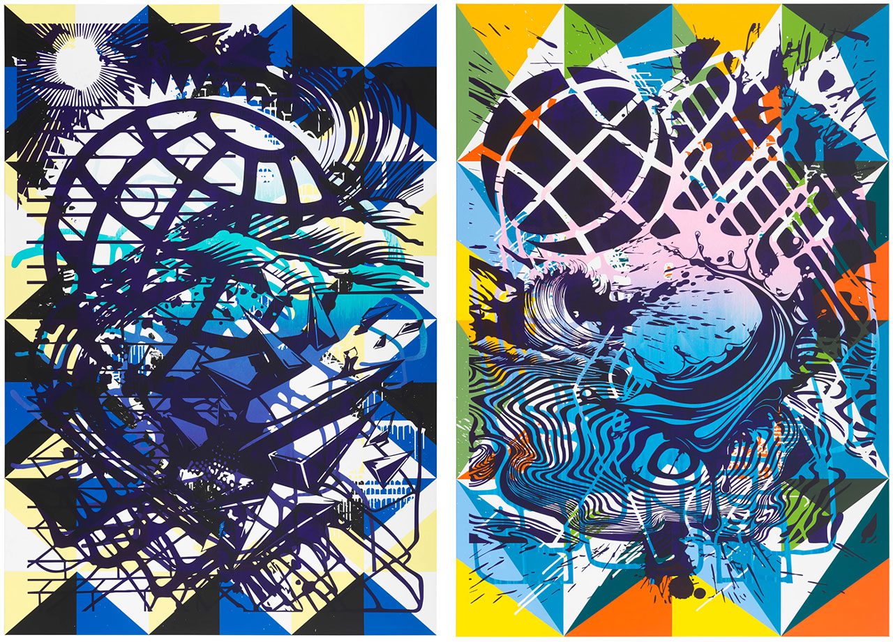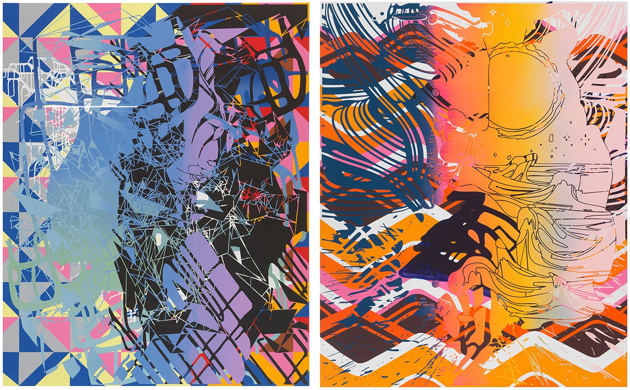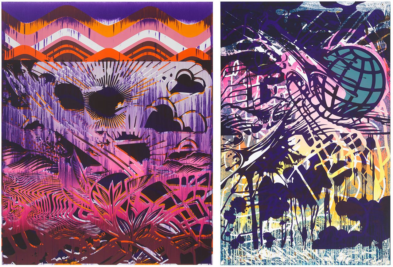 Photo left: Christine Streuli, Daily_news_03, 2025, Acrylic and varnish on canvas, 250 x 170 cm (98 ⅜ x 66 ⅞ in.), © Christine Streuli, Courtesy the artist and Galerie Peter Kilchman. Photo right: Christine Streuli, Daily_news_04, 2025, Acrylic and varnish on canvas, 250 x 170 cm (98 ⅜ x 66 ⅞ in.), © Christine Streuli, Courtesy the artist and Galerie Peter Kilchman