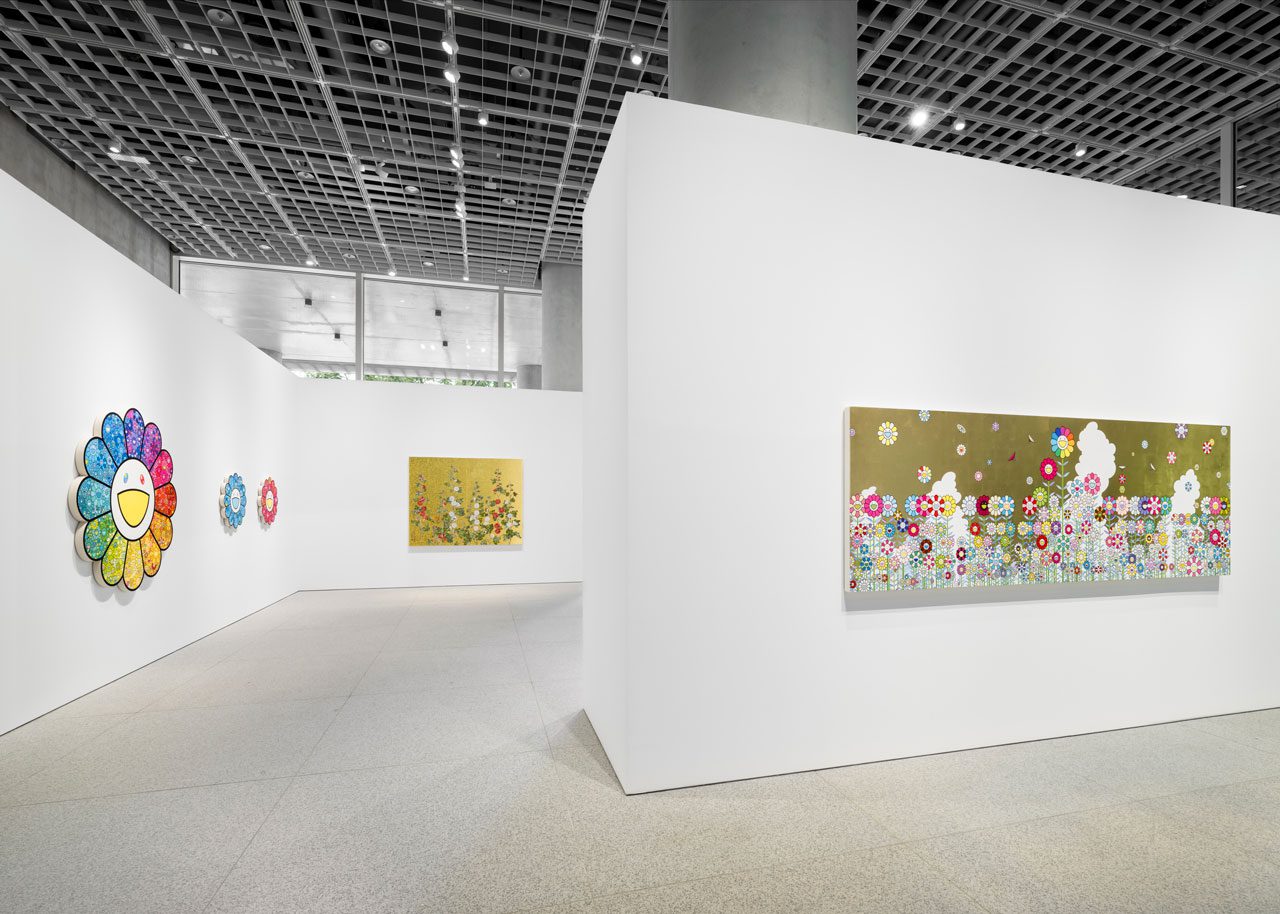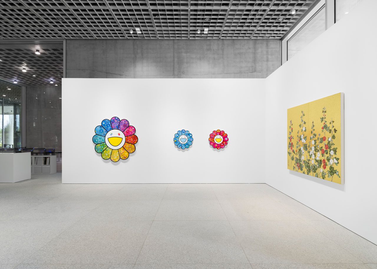 Right: Takashi Murakami, Superflat Shangri-La Square, 2025, Acrylic on canvas mounted on aluminum frame, 47 1/4 x 47 1/4 inches (120 x 120 cm), © 2025 Takashi Murakami/Kaikai Kiki Co., Ltd. All Rights Reserved, Photo: Kei Okano, Courtesy the artist and Gagosian