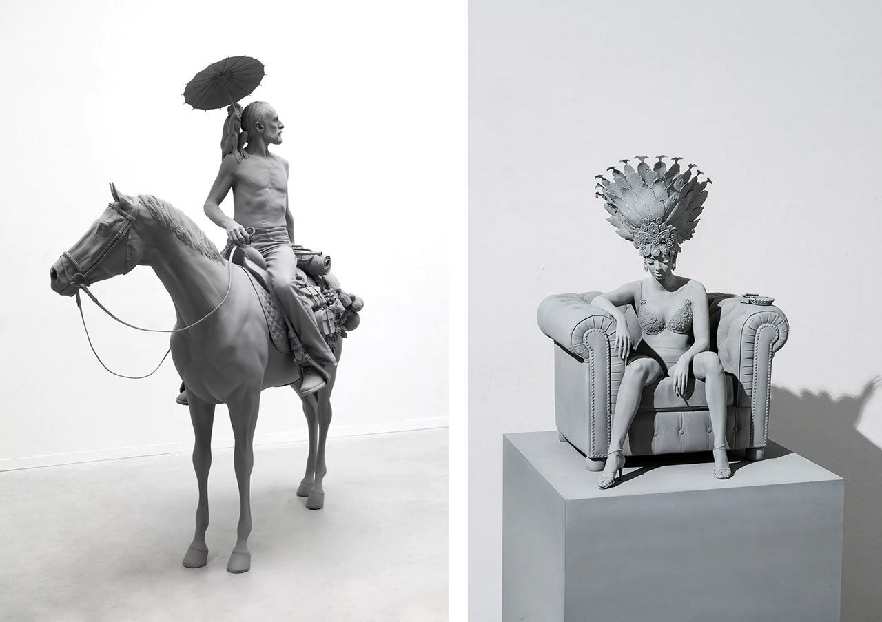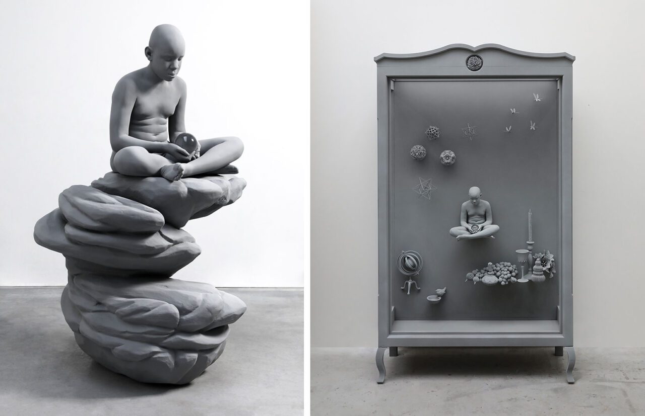 Echoing the multifaceted resonance of the word “vanishing”—whether understood linguistically as “disappearing suddenly and completely,” or mathematically as “becoming zero”—Hans Op de Beeck has long been captivated by those liminal moments when human beings drift into a state of dissolution. It is the instant when language falters, when logic and reason fall away, and when one briefly slips into a condition of self-loss and timelessness. These are the spaces where the self becomes anonymous, suspended, and free from narrative, and it is precisely here that his work unfolds. Op de Beeck’s monumental, often monochrome sculptural installations immerse the viewer in a hushed, introspective universe that contemplates temporality, memory, and the fragile condition of being human. His practice oscillates between minimalist restraint and elaborate, almost theatrical detail, constructing environments that are both familiar and otherworldly. What may appear at first as pared-down forms, cloaked in muted greys, in fact conceal layers of emotional resonance and an intricate web of cultural references. His imagined interiors, frozen landscapes, still lifes, and life-sized figures are less depictions of reality than evocations of suspended time—scenes where life pauses, fragments hover, and the linearity of narrative collapses. In his treatment of the human body and its surrounding spaces, Op de Beeck simultaneously draws from the grandeur of classical sculpture and the immersive language of cinema. Yet, unlike the triumphalism of classical statuary, his works lean toward an anonymous melancholy, underscoring the fleeting, transient nature of existence. The artist’s latest double exhibition unfolds like a contemporary Wunderkammer—a cabinet of curiosities in which the marvelous emerges not from whimsy but from an intensified perception of reality, transfigured into dreamlike states. His sculptures, with their velvety monochrome surfaces, are accompanied by a new black-and-white animated film and delicate watercolors, all amplifying the sensation of time momentarily stilled. Within this poetic staging, the visitor encounters a young girl with angelic wings lost in thought, a vitrine revealing a nocturnal pier crowned by a Ferris wheel under a starlit sky, and a life-sized horseman accompanied by a small monkey shading him with a parasol—each image a portal to a story untold. By subtly distorting scale, atmosphere, and context, Op de Beeck cultivates a productive estrangement: the familiar becomes uncanny, the ordinary shifts into the extraordinary. Each work plants the seed of a possible narrative, inviting viewers into an active, imaginative contemplation. In his signature grey palette, carefully orchestrated scenographies, and quiet theatricality, Op de Beeck elevates the prosaic into the poetic, where simplicity gives rise to wonder, and the fleeting becomes eternal—if only for a moment.