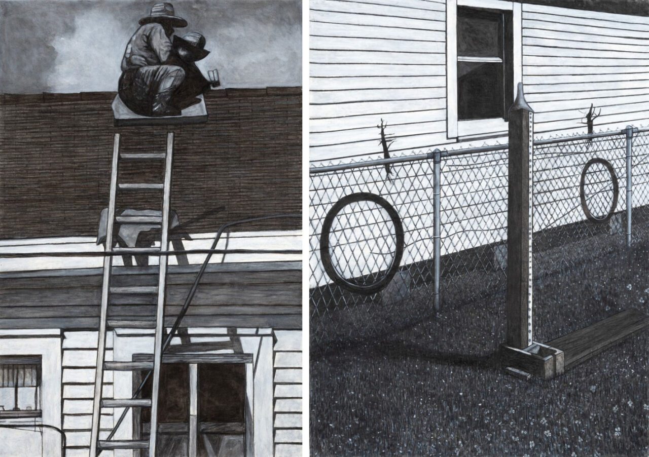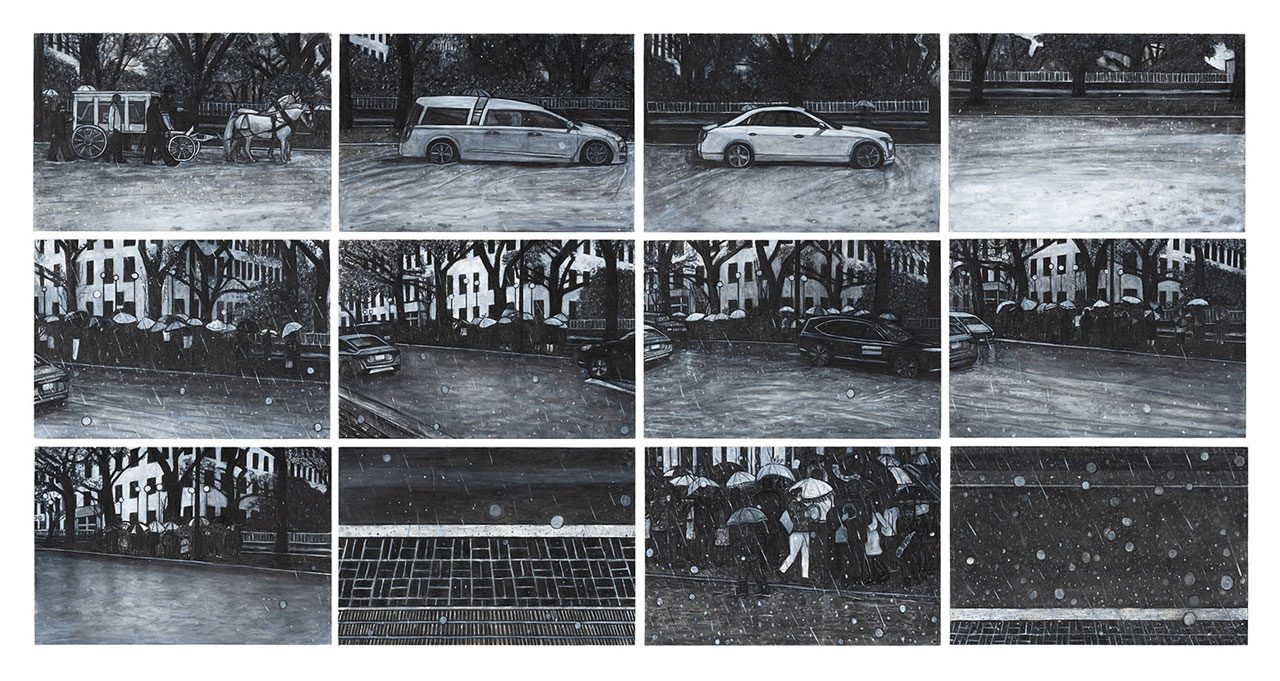 The twelve large-scale paintings that comprise Willie Birch’s solo exhibition “Up on the Roof” mark a new milestone in the artist’s decades-long commitment to visualizing the stories of his community. Shown together for the first time, these works chronicle the people, landscapes, and architectural structures that define Birch’s New Orleans neighborhood, rendered with an intimacy born of deep observation and lived experience. While Birch’s early practice was celebrated for its exuberant palette and bold figurative narratives, the turn of the new millennium brought a profound shift. Around the year 2000, he abandoned color entirely, embracing instead a rigorously restrained strategy of charcoal, graphite, and white acrylic on paper. This monochrome approach—layered, smudged, rubbed, and marked—has since become his signature. In the absence of color, Birch achieves a striking immediacy, one that compels viewers to slow down and attune themselves to texture, light, and form. The results are powerful works that weave together the grand sweep of history and politics with the quiet rhythms of daily life. His pictures are at once documents and allegories, bearing witness to the complexity of the human condition in its sorrow, resilience, and joy. Objects in Birch’s world are never mere objects. A garden gate, a ladder, a trellis, or the siding of a house transforms under his hand into a visual metaphor charged with symbolic resonance. His compositions are dense with references—to the African diaspora and global art history, to the legacies of American politics, and to the cultural vitality of New Orleans. At the same time, they remain profoundly personal: tender testaments to a place and its people, refracted through Birch’s own life experience, and, in turn, rising to embody collective truths. One of the most striking examples of this symbolic layering appears in “Melting Snow #3” (2025), a rare image of New Orleans blanketed by a historic snowstorm on January 21, 2025. In a city more accustomed to subtropical heat than icy weather, the snowfall was both magical and uncanny, a fleeting rupture in the ordinary. Birch captures this moment in his own backyard: blades of grass pierce through melting frost, a triangular trellis hovers above a cross-shaped flower box, and elongated shadows fall across clapboard siding. Yet beneath the quiet beauty lies a somber meditation. The snow gestures toward climate volatility, reminding us of the mounting threats of global warming. The trellis and triangular shadows, meanwhile, allude to the pyramids of Ancient Egypt and, by extension, to the diasporic legacies that shape New Orleans. The cross-shaped planter suggests the crossroads, a place of decision, of endings and beginnings. Snow melts into water, signaling both impermanence and renewal. With its ominous dark sky and fragile glimmers of rebirth, Birch’s composition becomes not only a portrait of a storm, but also a meditation on resilience, transformation, and survival. If “Melting Snow #3” foregrounds the interplay between nature and human resilience, Birch’s monumental twelve-part installation, “Procession for “Kidd” Jordan: A Fitting Farewell” (2023–2024), turns toward cultural memory and collective ritual. Occupying the entire second floor of the gallery, the work serves as an elegiac tribute to the late saxophonist Kidd Jordan, a revered musician and close friend of the artist. In it, Birch captures the singular New Orleans tradition of the jazz funeral, in which mourning and celebration entwine: a brass band leads the “first line” of family and musicians, while the “second line” swells with dancers, revelers, and neighbors. Birch unfolds this procession in a sequence of panels that read from right to left—against the current of Western visual convention, against the flow of traffic, and in tune with the syncopated rhythms of jazz itself. The repetition of figures, rendered in high-contrast black and white, evokes the cadence of drums and the ebb and flow of collective movement. A heavy downpour drenches the crowd, but does not break its spirit; the mourners-turned-celebrants march on, their umbrellas raised in both grief and defiance. The hazy atmosphere and stark tonal contrasts convey Birch’s heightened emotional state, translating sound into vision, rhythm into form. At once intimate and communal, the piece is a love letter to a friend, a city, and a tradition that binds them together. Everyday life, too, finds a place in Birch’s oeuvre. “Two Roofers and a Ladder” (2022) turns its attention to the unsung laborers who build and sustain the city. Two workers, paused in a moment of rest, perch atop a house beneath the searing Southern sun. Their wide-brimmed hats recall 19th-century French realism, while the rhythmic repetition of horizontal lines in the ladder and siding suggests both the cadence of manual work and the pulse of New Orleans jazz. In their crouched poses and stoic endurance, the roofers echo the peasant figures of Gustave Courbet’s “The Stone Breakers” (1849), grounding Birch’s vision in a lineage of art that dignifies labor and exposes its conditions. Yet unlike Courbet’s anonymous figures, Birch’s roofers are imbued with a heightened perspective, literal and metaphorical. Elevated above the city, they see more than others can. In their presence, Birch suggests, lies the wisdom of experience and the quiet heroism of survival. Taken together, the works in “Up on the Roof” reaffirm Willie Birch’s singular voice in American art. His monochrome worlds are not stripped of color but saturated with meaning. They hold within them the pulse of jazz and the scars of history, the intimacy of neighborhood life and the sweep of global change. Rooted deeply in New Orleans, yet resonant far beyond it, Birch’s art reminds us that the ordinary is never merely ordinary, and that in every roof, ladder, garden, and proc