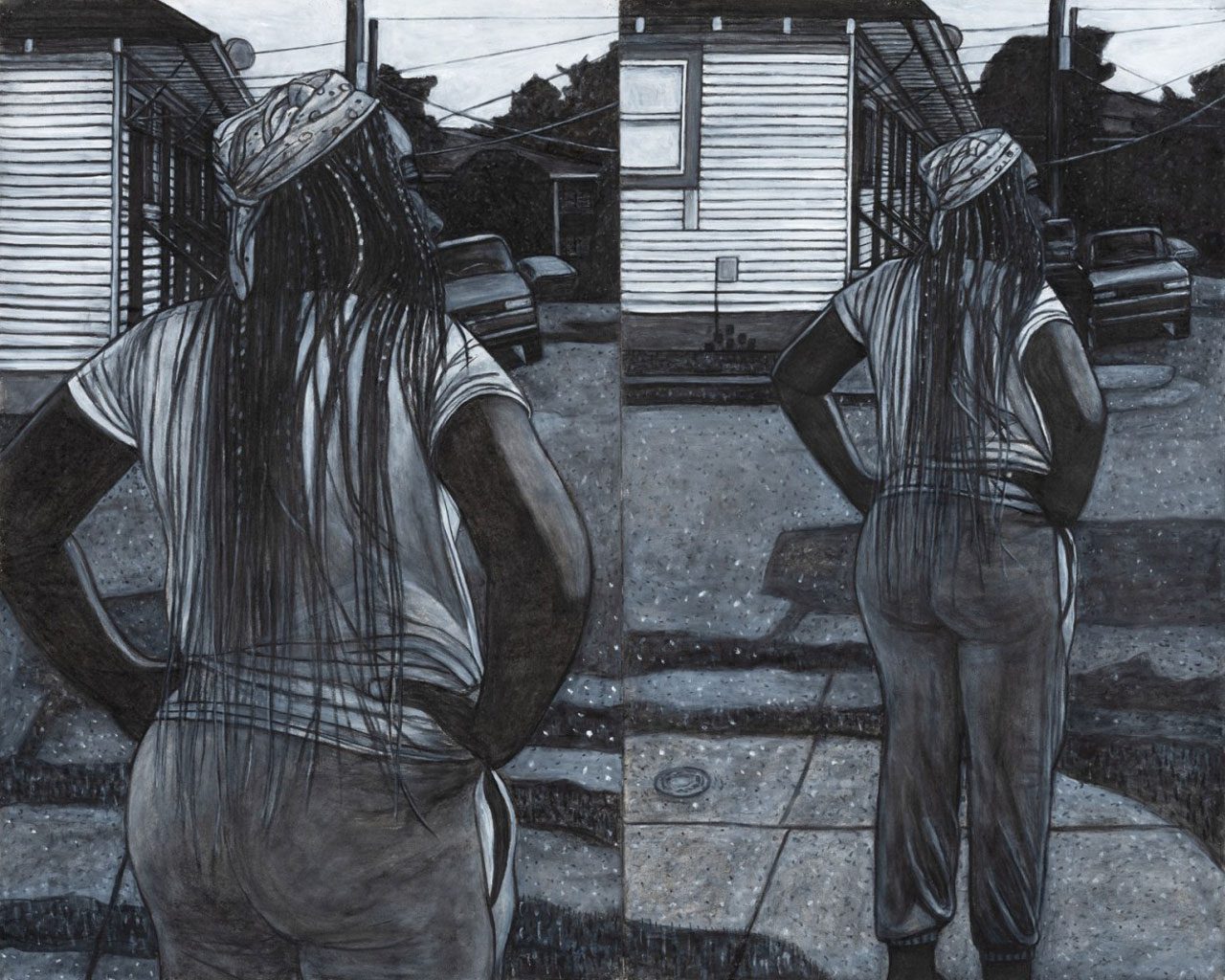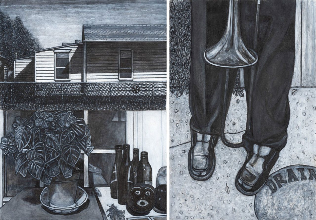 Right: Willie Birch, In the Tradition, 2015, Acrylic and charcoal on paper, 36 x 24 in, © Willie Birch, Courtesy the artist and Fort Gansevoort