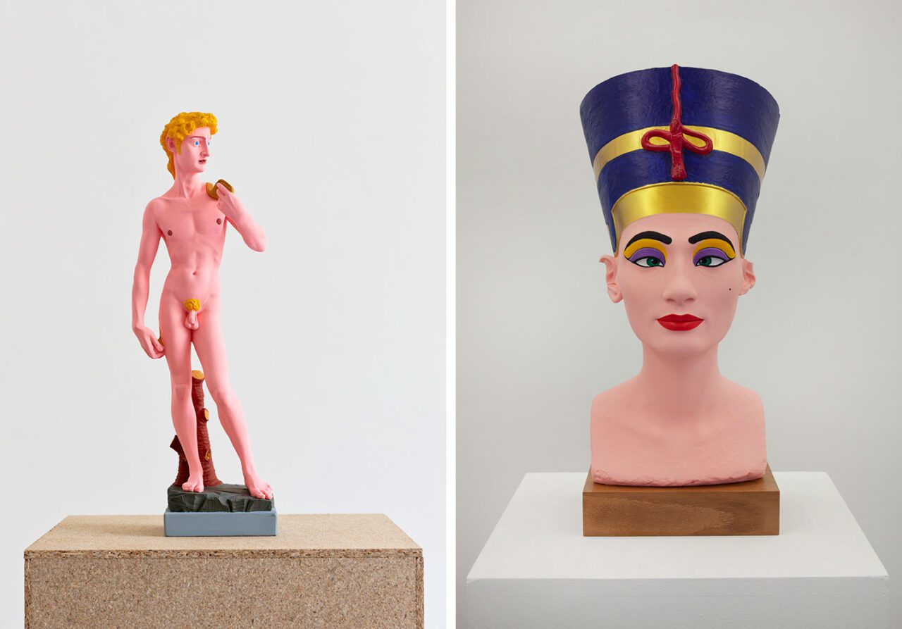 Right: Hans-Peter Feldmann, The Bust of Nefertiti, 2012, plaster, painted, 45 x 25 x 25 cm, private collection, photo: Ludger Paffrath, © VG Bild-Kunst, Bonn 2025
