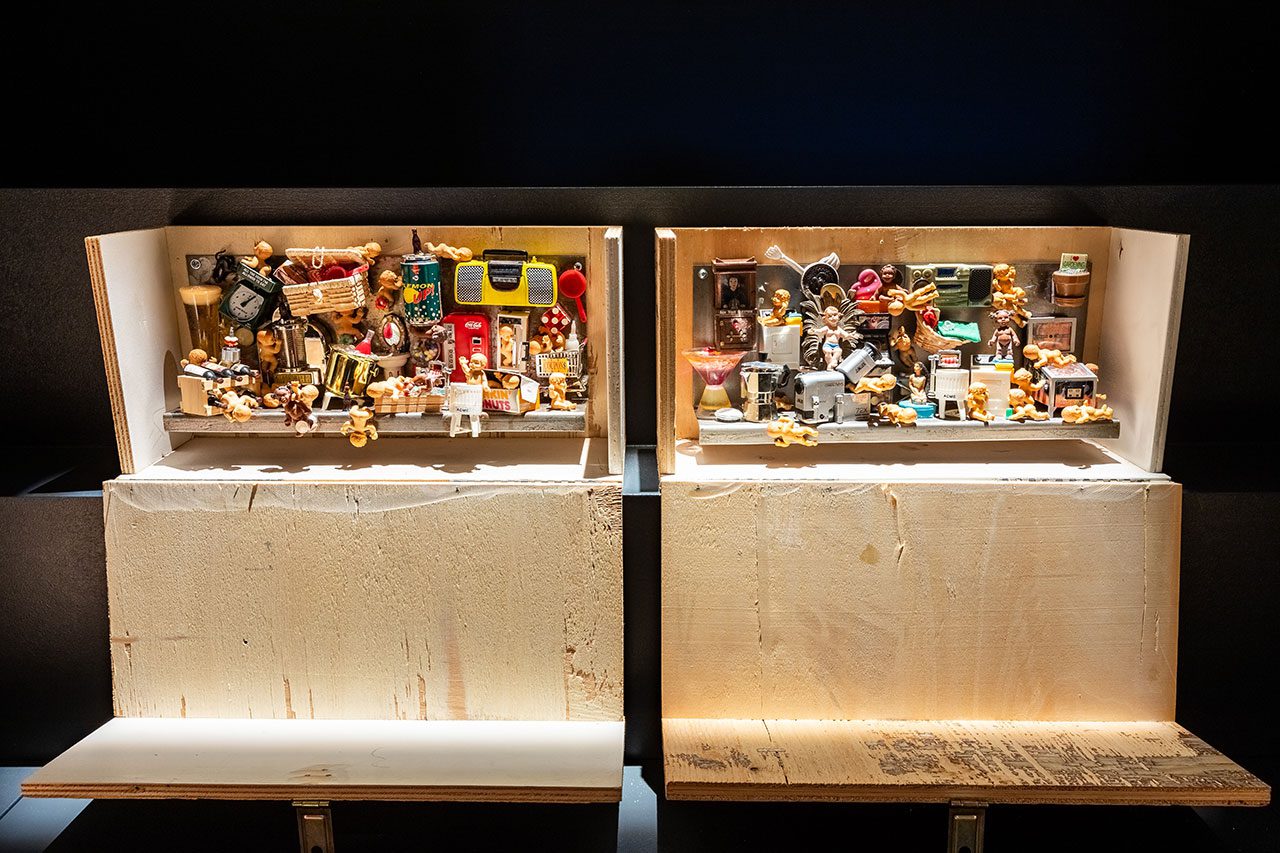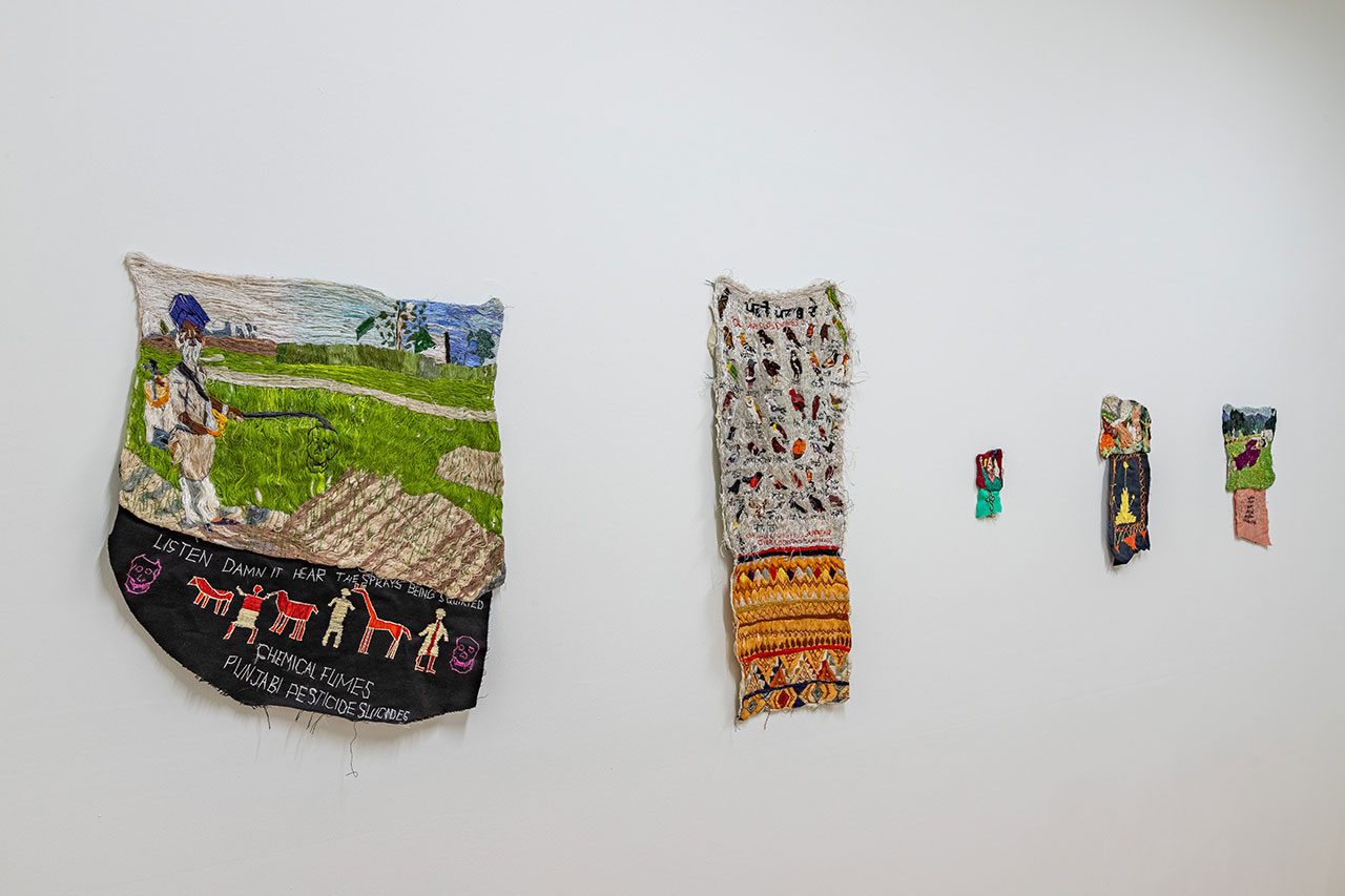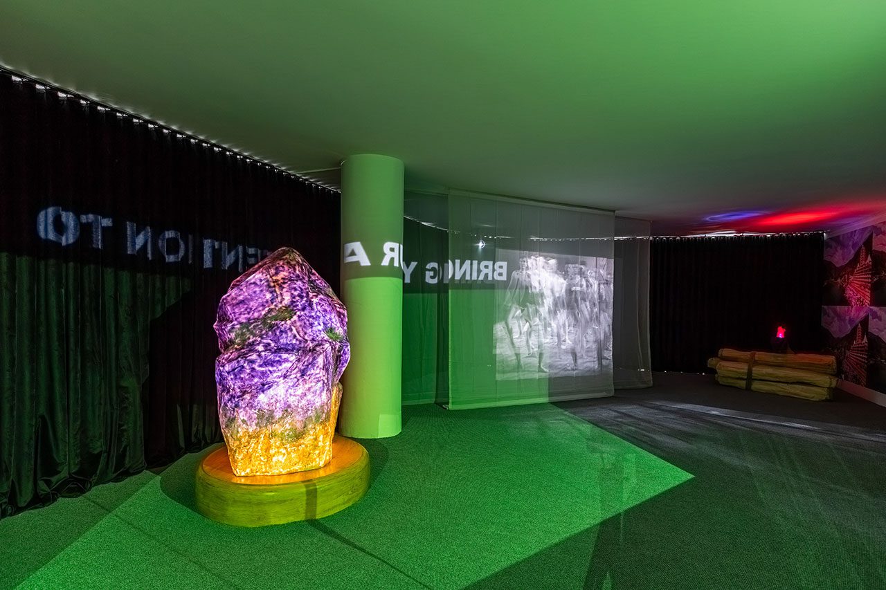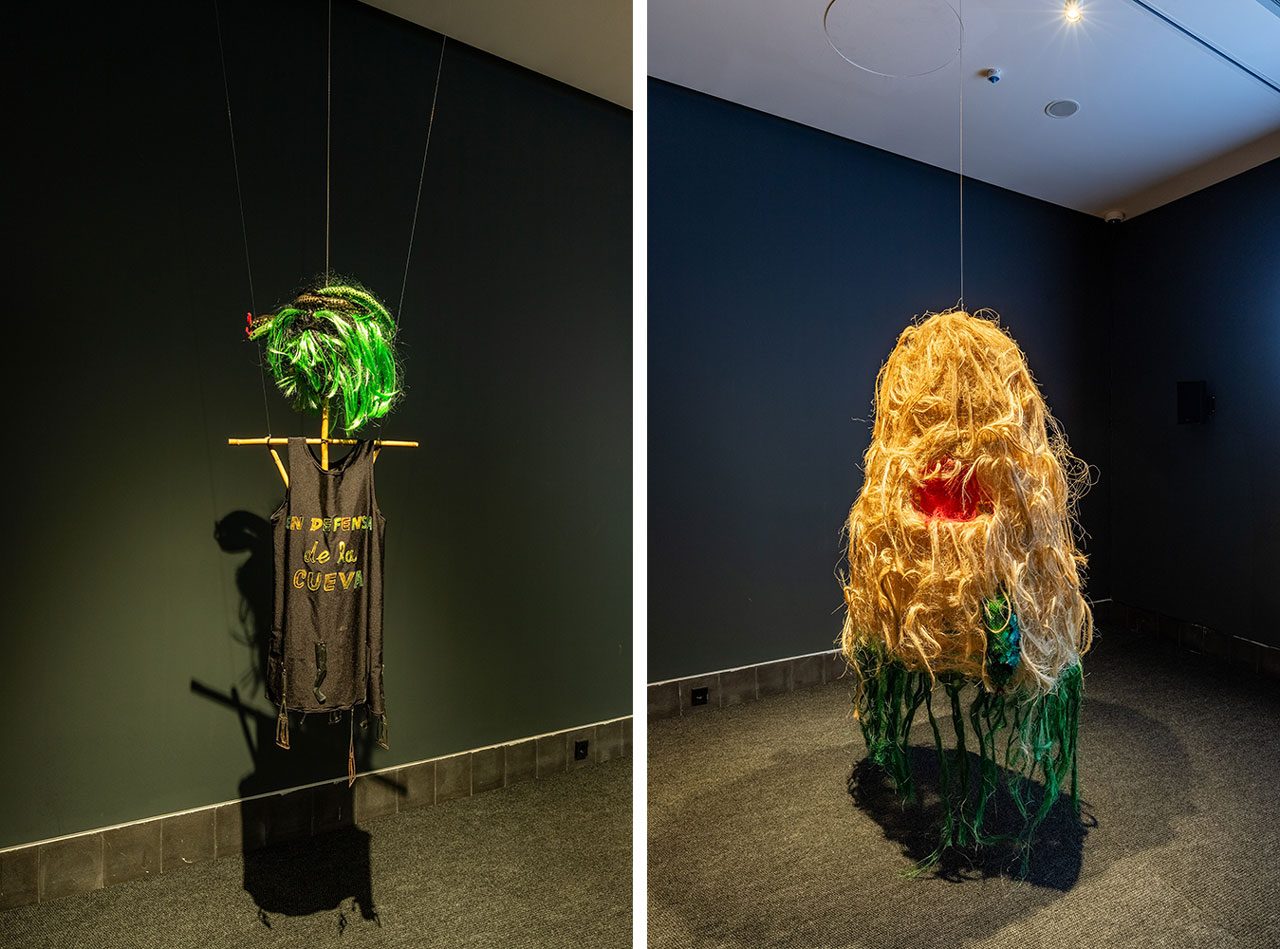 Stéphanie Saadé’s “Pyramid” (2022) series is composed of everyday clothing items, such as socks, T-shirts and leggings layered and sewn into one another in an incremental fashion, from the smallest infant size to largest adult sizes. Forming a gently sloping, vertical silhouette, the works resemble a stratified monument of growth and care, testifying to the evolution of intimate matter as well as its relationship to the body. The resulting structure is both familiar and uncanny: a cartography of life stages that materialises time as both visible and tactile. With “Pouring Without End and Spilled in Good Faith” the artists duo, VASKOS (Vassilis Noulas & Kostas Tzimoulis) revisits the iconography of ‘Greekness’, an idea sustained by the Greek state and tourism industry in attempts to monetise history. Within the vividly coloured visual realm of the textile panels, the duo take up the symbol of the jug or amphora, which has long been a shorthand symbol for Hellenic identity in the historicisation of Greek civilisation and mythology. Here, depictions of the artists themselves are interwoven with motifs from classical antiquity and other ornamental icons. Naomi Rincón-Gallardo’s “Resiliencia Tlacuache / Opossum Resilience” (2019) is part of “A Trilogy of Caves”, which is a series of politically grounded yet playfully psychedelic videos inspired by and shot in the Mexican state of Oaxaca. Oaxaca continues to experience the deleterious effects of land dispossession, such as those in the wake of recent aggressive mining concessions that have exacerbated existing social conflicts. Blending surreal and psychedelic imagery, the installation features a projected video surrounded by suspended sculptures – costumes and accessories worn by the characters on screen – elaborating a multi-layered aesthetic where layers of reality and mythology are continually subverted. Overlapping the deep time of creation with the contemporary socio-environmental reality of a mining project imposed on an Indigenous territory, the film is directly informed by research and interviews done by Rincón-Gallardo with Zapotec lawyer and activist Rosalinda Dionicio about resistance, art, ancestral memory and fiction. “A Horn That Swallows Songs” (2025) by Doruntina Kastrati investigates the residual cost of invisible labour – particularly that performed by women – in Istanbul’s Turkish Delight (lokum) factories. The installation unfolds across two rooms, generating an immersive environment that echoes the conditions of the factory floor: endless shifts, repetitive rhythms and prolonged standing. Meanwhile, low-frequency vibrations emanating from ultrasonic speakers, floor transducers and sub-woofers travel through the floor into viewers’ bodies, transmitting a visceral bodily sensation. At the heart of the installation stands a polished metal structure embedded with four video screens. Each screen displays documentary footage drawn from Kastrati’s field visits to lokum factories, including interviews with workers. One video features a single narrator’s voice taken from interview transcripts, highlighting the gap between the workers’ realities and the sanitised versions of management, further underscoring the enforced silence and controlled narratives surrounding their labour. While the presence of supervisors in these interviews is subtle, their influence remains palpable – shaping not only the workers’ conditions, but also their capacity for speech, expression and disclosure. In an adjoining room, a sculpture fashioned from repurposed factory machinery takes the form of a horn-like vent, recalling those used in halva-making and underscoring the entanglement between sound, labour, and architectures of production.