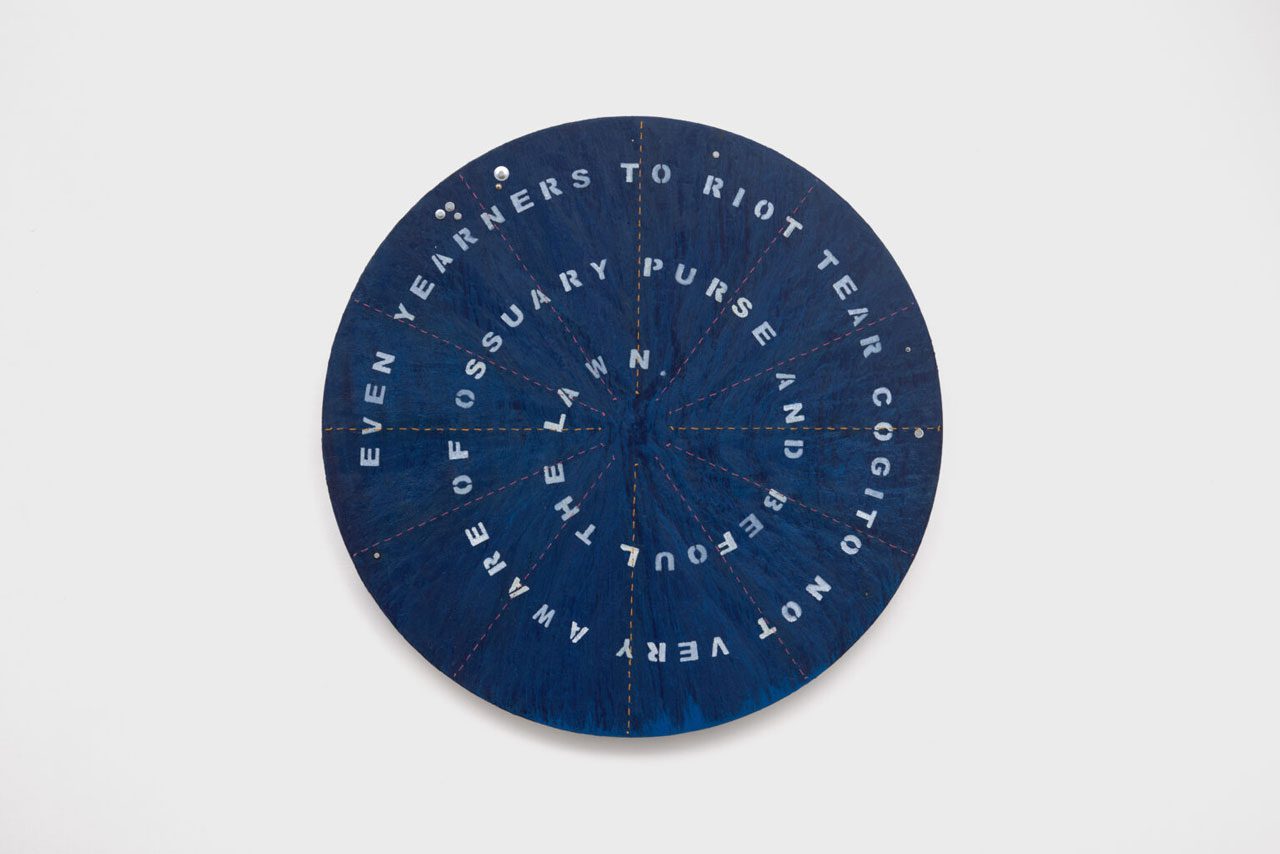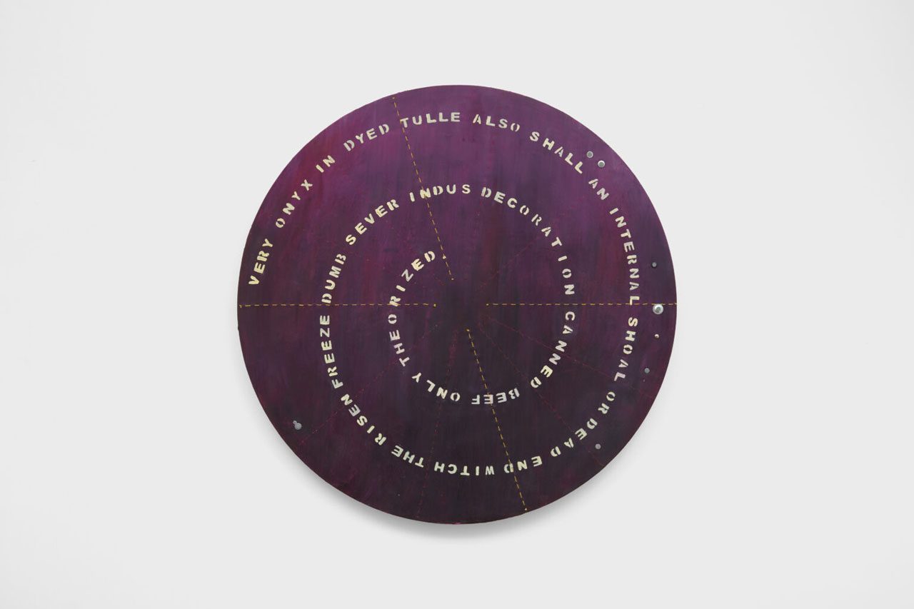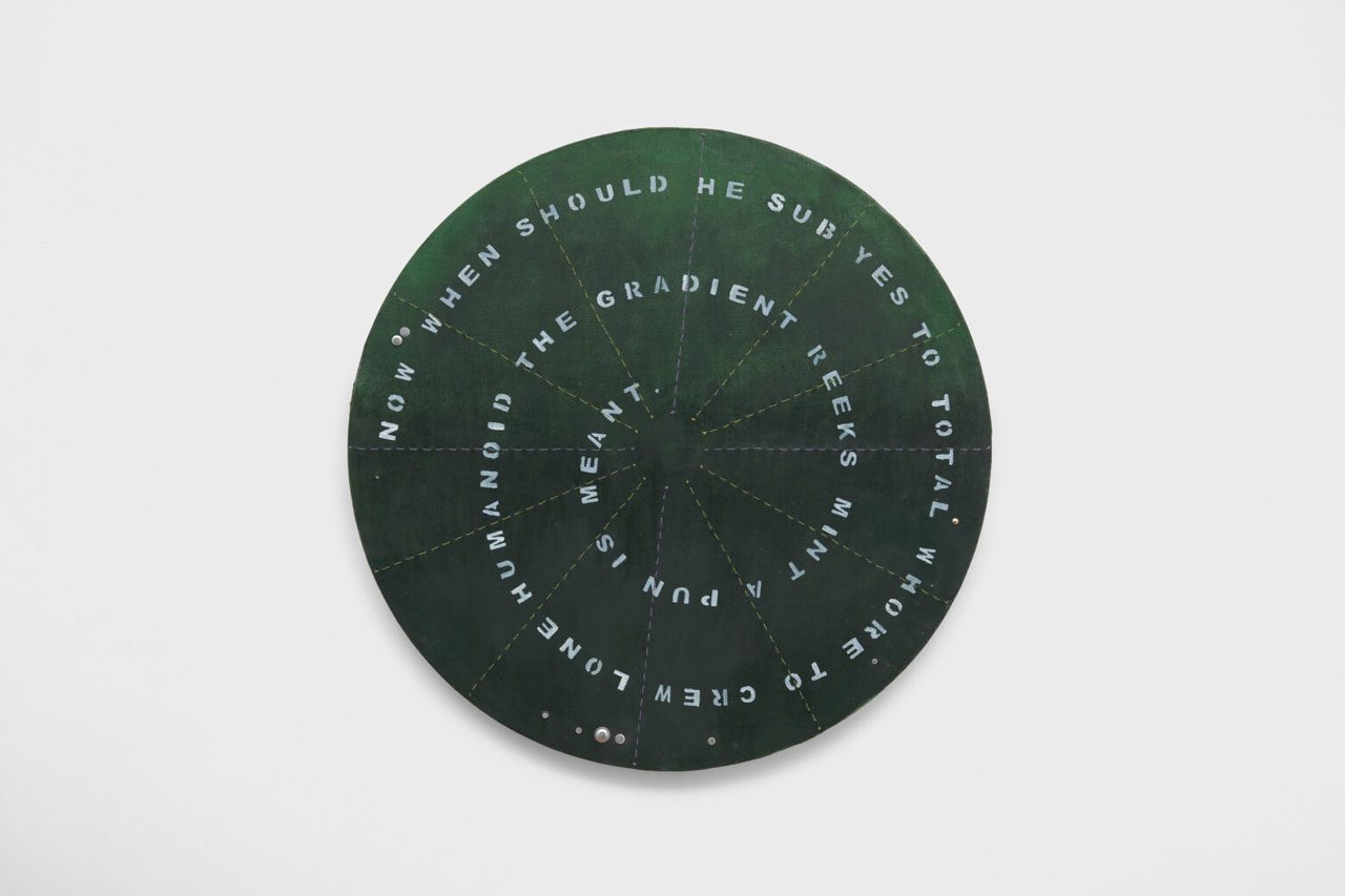 “HUSH MR GIANT”—an anagram of human rights—is the title of Hannah Black’s solo exhibition, comprising six circular oil-on-canvas paintings that echo the rotating word-disks in Marcel Duchamp’s surrealist film “Anemic Cinema”. Each canvas spirals outward with warped text drawn from six different articles of the Universal Declaration of Human Rights (1948). Through homophony, the solemn cadences of international law collapse into nonsensical verse: “Everyone has the right…” dissolves into “even yearners to riot…”, and so on. This “sounds-like” methodology refuses stable meaning, instead generating unpredictable associations within language. Such homophonic play, as Lacan describes, is a deposit of collective unconscious experience, a petrified layer where words lose their referential certainty—“the death of the sign it carries.” This breakdown of meaning gestures toward a historical truth: the liberal-humanist vision of universality, while never truly enacted, once held immense ideological weight. That vision has now been spectacularly dismantled, replaced by a frank regime of domination where “might is right” serves as global doctrine. The Declaration itself, drafted in 1948 in the shadow of World War II and the Nazi genocide, coincided with the colonization of Palestine and preceded the wave of decolonial struggles that shook the mid-twentieth century. Authored under the authority of the victorious Allied powers, it was never legally binding, and it smuggled in Western hegemony under the guise of universality. Seventy-seven years later, its promises reverberate grotesquely: “humanitarian values” arrive as airstrikes, sanctions, blockades, and torture. What once posed as universal ethics now serves as a mutilated cover for domination. This betrayal traces back to the revolutions of the eighteenth and nineteenth centuries, whose radical egalitarian impulses were swiftly calcified into new rationalizations for conquest and exploitation. Against this ongoing ruin, Black’s paintings reach toward surrealism as a fragile line of hope. In the words of Suzanne Césaire, surrealism becomes “the tightrope of our hopes,” stretched precariously across the abyss of fascism. For Césaire, surrealism’s inner freedom marked an opening beyond the suffocating rationalities of colonial rule; for Black, it remains a way to conjure resistance, even if that resistance feels at times powerless against the machinery of state and empire. Formally, each painting is punctured with nails and threaded to map the astrological event chart of a historical revolution corresponding to the article it distorts. Article 4, which declares that “no one shall be held in slavery or servitude,” aligns with the Haitian Revolution, while Article 13, affirming the right “to return to one’s country,” is marked by the Great Palestinian Revolt of 1936. These constellations remind us that “rights” are not benevolent gifts bestowed from above, nor eternal truths, but contingent outcomes of struggle, rebellion, and collective psychosis. In this sense, “HUSH MR GIANT “exposes both the absurdity and the violence embedded in the discourse of rights. The paintings reveal how language fractures under the weight of history, and how universality, always compromised, survives only as a dream continually re-inscribed by those who fight at its margins.