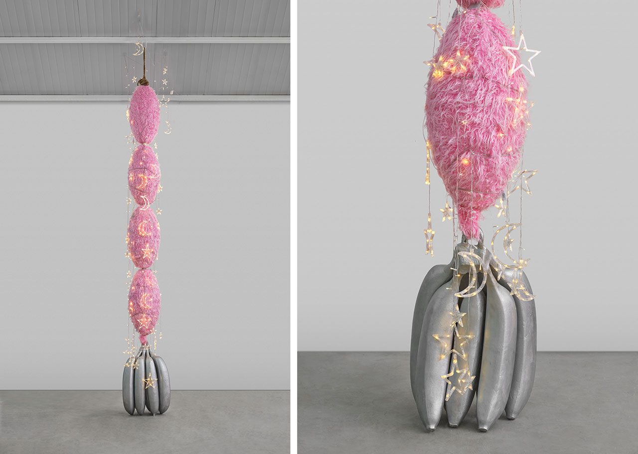In “Teenager”, her first solo exhibition in Austria, Guan Xiao presents an entirely new body of sculptures and paintings that explore the liminal, uncertain, and often turbulent state of adolescence. Described by the artist as an “ambiguous life stage,” the teenager becomes both a subject and a metaphor — a psychological condition that mirrors the contradictions of our contemporary world. Through her hybrid forms and surreal environments, Guan examines how societies shaped by capitalism and liberalism navigate the uneasy balance between desire and discipline, tradition and transformation, individuality and conformity. At the centre of the exhibition, a large, furry A-frame structure bisects the gallery, forming a tunnel that acts as both passage and threshold. Animated by light and smoke, the structure contains a constellation of cast aluminium objects — enlarged items of domestic familiarity: a moka pot, cutlery, and a cluster of magnified eggs. This curious environment, hovering between the dreamlike and the absurd, suggests a theatre of transformation where everyday forms are reimagined at an unfamiliar scale. Surrounding this core installation, a series of gnarled, brass-cast tree roots are meticulously painted and fused with motorcycle parts and cartoon-like clouds of scribble. These hybrid beings — part machine, part myth — populate the exhibition like a cast of eccentric figures. Some are equipped with mesh plates and antennae-like extensions, as if attuned to invisible frequencies or signals. Two modular columns extend pink and blue aluminium arms from claw-like bases resembling oversized bunches of bananas, further complicating distinctions between the organic and the artificial, the technological and the sensual. On the surrounding walls, a triptych of palette-shaped panels, thickly layered with paint, evokes windows that are at once reflective and opaque — a gesture that suspends the viewer between looking and being looked at. Trained initially as a filmmaker, Guan Xiao’s sculptural practice retains a cinematic sensibility — one attentive to framing, rhythm, and the construction of meaning through juxtaposition. Her works often encourage the viewer to weave their own stories, activating a narrative impulse that is neither linear nor literal. Earlier installations resembled museological displays or improvised photography studios: assemblages of disparate objects and images that conjured new relationships through proximity and contradiction.