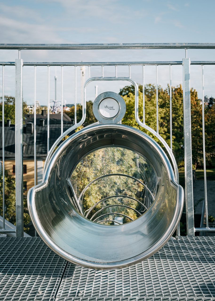 Carsten Höller refers to his artistic practice as the creation of “influential environments” – immersive installations that are designed not only to be seen, but to be felt, experienced, and inhabited. His works are not passive objects of contemplation, but situations that actively provoke states of exhilaration, disorientation, doubt, joy, and fear. With his art, Höller invites us to step out of the ordinary and into carefully staged experiences that challenge both body and mind. One of his most ambitious projects to date, “Stockholm Slides”, has now been installed on the façade of Moderna Museet. This monumental work consists of two parallel spiral slides that begin on the museum’s rooftop and extend dramatically down to Slupskjulsvägen, on the building’s waterfront side. The slides officially open to the public today, offering a new way to encounter both art and the museum itself. The slides are each about 39 metres long and share the same design, but in mirrored form. One curves clockwise, the other counterclockwise, creating a visual and experiential symmetry. With a drop height of 15 metres, riders begin at the roof and descend toward the ground in a thrilling, spiraling movement. Two people can ride simultaneously, their mirrored trajectories forming a kind of choreography in motion—a duet shaped by gravity, speed, and chance. For Höller, the act of sliding is never just play. It is a deeply psychological and bodily experience. The downward movement engages the body in ways that are at once childlike and profound, triggering a complex interplay of emotion and thought. The rider gives themselves over to gravity, entering a controlled state of free fall that produces what Höller describes as a “regulated loss of control”. In this space of surrender, sensations of fear, delight, anticipation, and exhilaration coexist, often inseparably. As the sociologist Roger Caillois once phrased it—a formulation that Höller embraces—the slide produces a state of “voluptuous panic upon an otherwise lucid mind.” Although the slides can only accommodate two riders at a time, their impact reaches far beyond those who take the plunge. Passersby on Slupskjulsvägen, visitors entering the museum, and diners at the restaurant whose windows face the slides all become part of the artwork. Watching the sudden rush of bodies spiraling downward, the laughter, the brief shrieks, and the unpredictable emotions on riders’ faces can be just as affecting as the act of sliding itself. In this way, “Stockholm Slides” functions as both a personal and a collective experience, reshaping the social dynamics of the museum space.