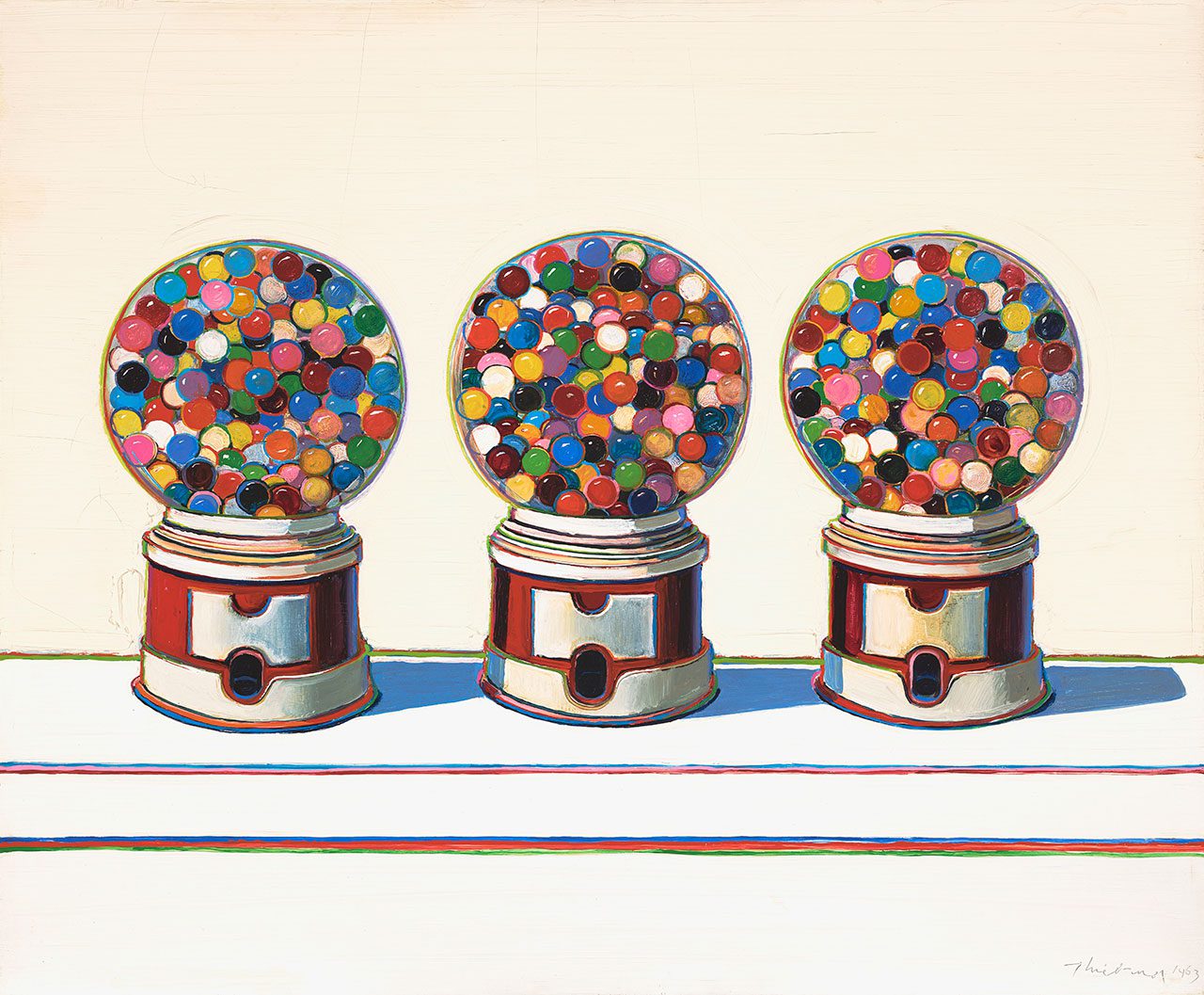 The exhibition “The Griffin Catalyst Exhibition: Wayne Thiebaud. American Still Life” celebrates the artist’s breakthrough works of the 1960s—paintings that cemented his reputation and redefined the still-life genre for the modern age. It gathers together some of Thiebaud’s most iconic and visually arresting compositions: lush depictions of quintessentially American subjects—cherry pies, hot dogs, gumball machines, and pinball tables—rendered with a richness of texture and color that turns the familiar into the sublime. Through these works, Thiebaud revitalized still life, transforming the everyday symbols of American consumer culture into meditations on beauty, abundance, and desire. The exhibition features rarely lent works from major American institutions and private collections. Highlights include the monumental “Cakes” (1963), loaned for the first time outside the United States by the National Gallery of Art, Washington, D.C., and “Four Pinball Machines” (1962), one of the artist’s most ambitious canvases, on loan from a private collection. Additional masterpieces have been generously lent by the Whitney Museum of American Art, the Smithsonian American Art Museum, and the Fine Arts Museums of San Francisco, among others. “Four Pinball Machines” (1962) marks a turning point in Thiebaud’s artistic evolution. The painting’s electric palette and tactile brushwork elevate the gleaming surfaces of arcade machines into a study of light, space, and color. Without formal art-school training, Thiebaud developed a highly personal realism—simultaneously representational and abstract. His fascination with paint’s materiality transforms these mechanical forms into vibrant compositions pulsing with energy and rhythm, revealing the painter’s deep engagement with the challenges of perception. In “Cakes” (1963), an orderly procession of pastries sits atop slender stands, echoing the geometry of a bakery display. The cakes’ shadows and outlines form a tightly structured grid, evoking both harmony and tension: the stands seem too delicate to support their opulent burdens. The nearly monochrome background flattens space, merging tabletop and wall, while Thiebaud’s pastel hues—creams, pinks, and yellows—lend the composition a dreamlike unity. The result is at once celebratory and contemplative, suggesting the seductive repetition of consumer life. The thick impasto and luminous highlights distinguish Thiebaud’s painterly approach from the flat, detached surfaces of Pop Art, reaffirming his commitment to the expressive possibilities of paint. Similarly, “Three Machines” (1963) exemplifies Thiebaud’s fascination with the beauty of the commonplace. Three vividly colored gumball dispensers, rendered in frontal alignment, dominate the canvas. Their saturated reds, greens, and blues vibrate with life, while the precise interplay of light and shadow lends them a sculptural presence. Despite their mechanical nature, the machines appear monumental, even anthropomorphic. Through Thiebaud’s brush, the ordinary becomes extraordinary—a quiet testament to the artist’s ability to find poetry in the most familiar corners of modern existence. Ultimately, Wayne Thiebaud’s art captures the contradictions of American life in the 20th century—its sweetness and isolation, its simplicity and complexity, its beauty and banality. The Exhibition invites viewers to rediscover Thiebaud not merely as a painter of cakes and confections, but as one of the great humanists of modern art, whose still lifes continue to reflect the spirit, longing, and vitality of his era.