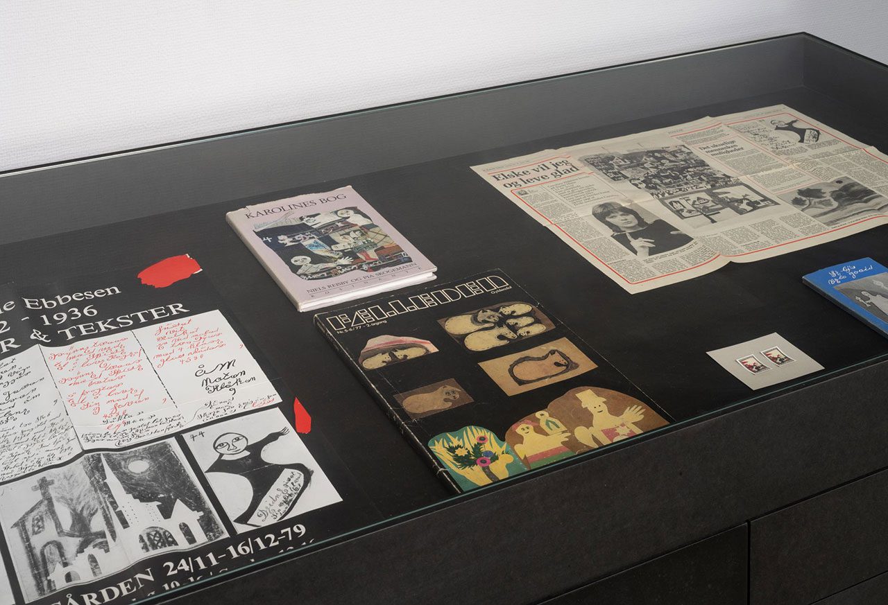 in “Kaååråålines Vers” Karoline Ebbesen’s historical works are displayed alongside works of five contemporary artists who, across time and place, have found kinship and inspiration in her world of text and images: Lise Haller Baggesen, Line Storm, Gudrun Hasle, Georgina Maxim, and Matilde Duus. Drawing from Ebbesen’s practice, the exhibition brings together new and older works featuring angels with one wing, windows in the chest, lanterns of love, pockets, dolls, moons, and sunbeams. By placing Ebbesen in dialogue with contemporary colleagues who over the years have discovered resonances in her life and work, the exhibition seeks to shed new light on her unique artistry and to show her continuing relevance today. The exhibition’s title is taken from one of her texts, reflecting her own phonetic spellings and her search for the higher divine. Central to her writings and images are religious themes, everyday life at Sct. Hans, and family members: among them, her deceased sister “Little Anna”. Ebbesen was immensely productive. Today, a few hundred of her works still exist: texts, appliqués, and images drawn, painted, or cut in paper, along with nine textiles. She often gifted her works to the hospital’s doctors, some of whom later donated them to the Museum Sct. Hans, which kindly lent them to this exhibition. Her works carry no notes on dates or titles. Instead, we unfold the most recurring motifs on the smaller exhibition signs, motifs that have also inspired many of the contemporary artists in this exhibition. Among them: the lantern of love, the moon, angels with one wing, windows in the chest, angel dolls, and pockets.