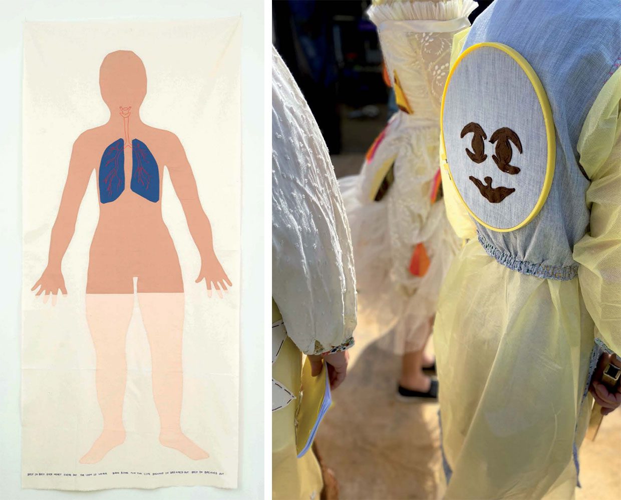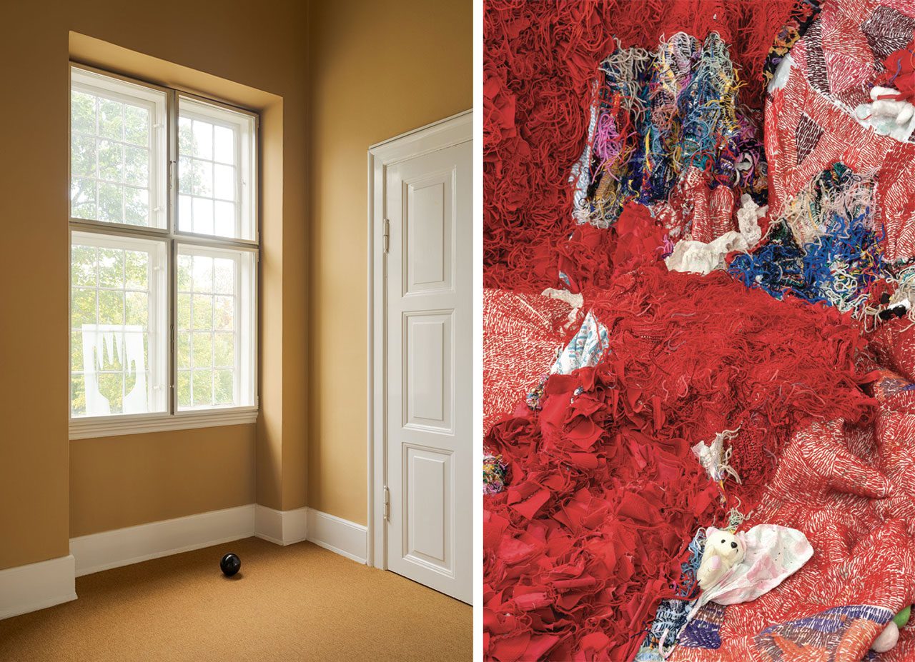 Lise Haller Baggesen’s work “Lille Solstråle sad og så på Månen” (Little Sunray Sat Watching the Moon) (2025) is a collaborative project between Baggesen, composer Anders Lauge Meldgaard and the choir BARK. The work comprises several sound compositions based on Ebbesen’s texts and costumes in the form of disposable PPE overalls with patchwork appliqué and embroidery inspired by Ebbesen’s imagery. Gudrun Hasle has created a new sculptural textile work inspired by Karoline Ebbesen’s recurrent motif of one-winged angels. The work, “Jeg har kun en vinge“ (I’ve Only Got One Wing) (2025), comprises a large angel wing with embroidered texts by Ebbesen and herself. Where Ebbesen created her own font, alphabet, and spelling, Hasle utilises her dyslexia in her artistic work with text and language. Hasle’s kinship reaches beyond language, technique, and materials. Ebbesen’s angels, their wings incomplete leaving them unable to fly, thus become emblematic of a fellowship stretching across time, not merely as artists but also as patients in psychiatric care, a subject addressed by Hasle in her early works. Georgina Maxim works with mending and repair in her textile works and installations: “Sewing, stitching, knitting, weaving, and appliqué are all granny manners. It is as if they are of a past time and yet they also celebrate alone times in a contemporary way—the ability to have serious patience and endure the monotony of the stitch.” In the exhibition, she presents several works, both new and older, including: “Treasure is Everywhere” (2025) placed on the red podium, is a patchwork of pockets and pouches from discarded psychiatric hospital garments from Mutare General Hospital in Zimbabwe. Matilde Duus’ encounter with Ebbesen’s works has had an immense impact on her practice. She began working with a system of symbols in her own works, inspired by Ebbesen, and found a new direction in her practice. Amongst the showcased pieces by Duus is “Sorte måne, vinkende hånd “(Black moon, waving hand) (2016) consisting of a hand and a black ball both made of glass. In a series of watercolors, Ebbesen paints black moons on the horizon, like an eclipse.