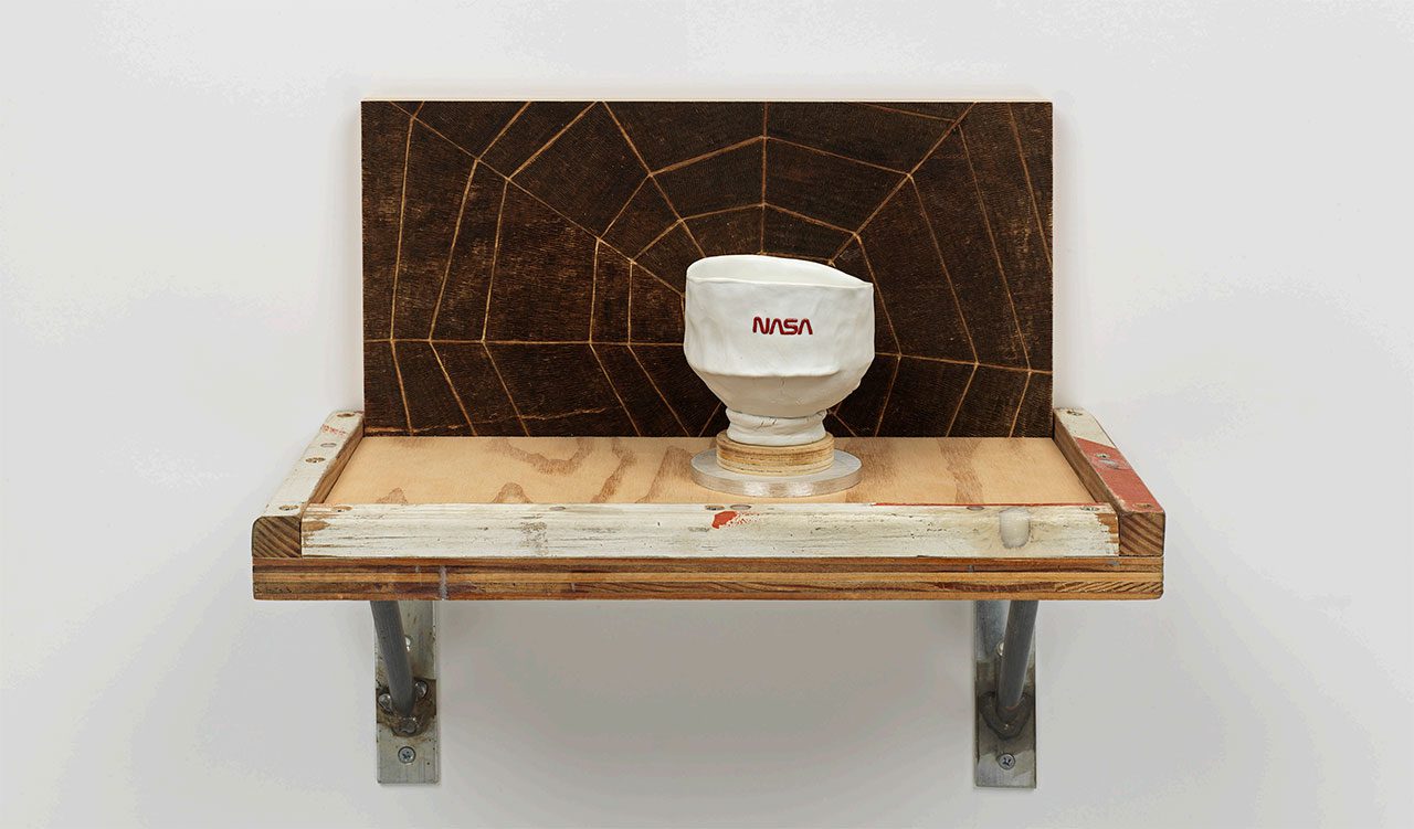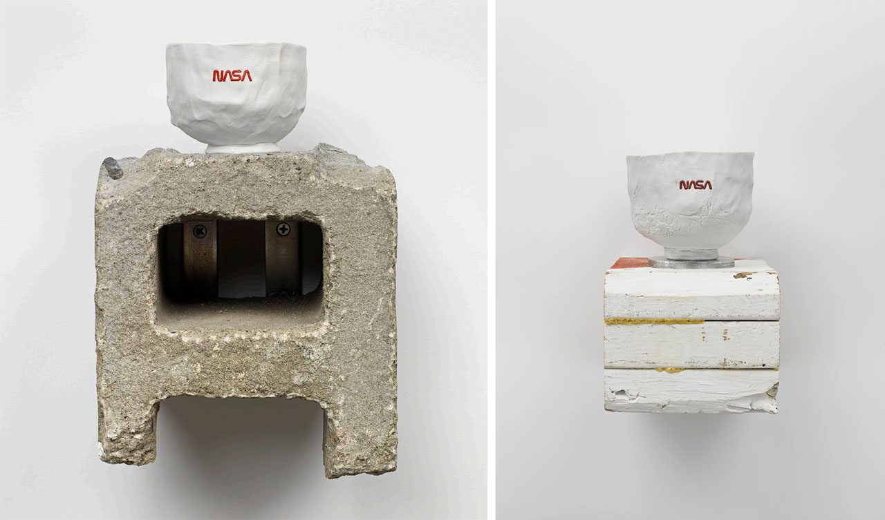 Right: Tom Sachs, Assurance of Infinity, 2025, English porcelain, plywood, latex, plastic and hardware, 36.2 x 22.9 x 25.4 cm (14.25 x 9 x 10 in). © Tom Sachs, Courtesy the artist and Thaddaeus Ropac Gallery
