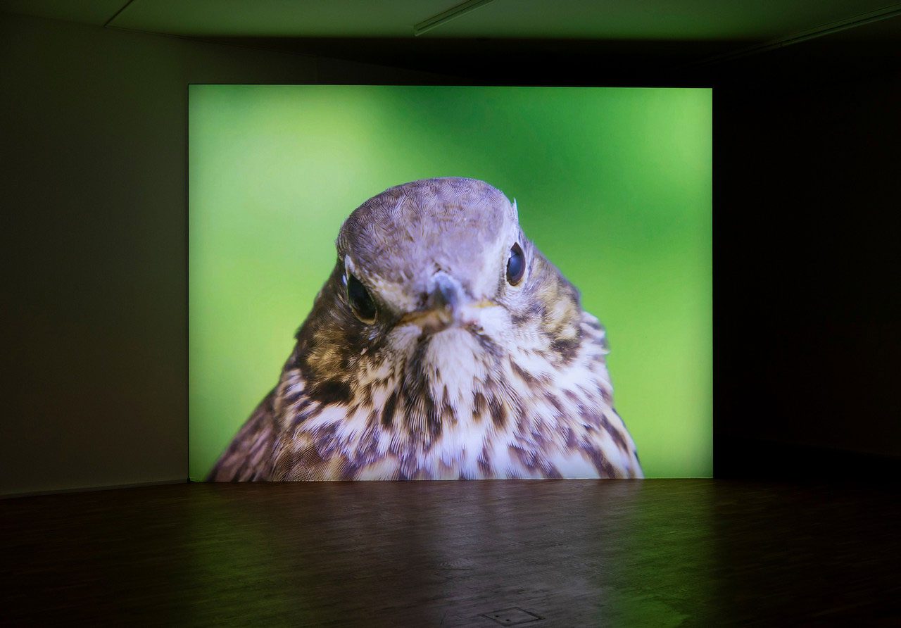David Claerbout’s solo exhibition “Five Hours, Fifty Days, Fifty Years” serves as an encapsulated overview and include both earlier and recent works from Claerbout’s complex oeuvre, as well as his new work “The woodcarver and the forest”, described by the artist as less to be seen and more to live with. It is a performative film installation operating like a ruthless deforestation machine disguised as a mindful and pleasant meditative scene programmed to last for several years during which a forest surrounding the woodcarver’s modernist villa will be depleted as its trees will be used to make wooden objects. The title of the film “The woodcarver and the forest” hints at the craft of woodcarving that has gained in popularity in recent years as a way to relieve screen fatigue and connect to nature while living indoors. Especially among young adults, woodcarving has become a popular way to regain focus, become mindful and improve fine motor skills. Indeed: watching a log transform into a spoon can be categorised among the ASMR effects (Autonomous Sensory Meridian Response), with gentle cutting and scraping sounds and movements having a calming effect on the observer. For David Claerbout, who seemed particularly sensitive to ASMR stimuli, the process of creating this film became a paradoxical experience: a sensation of feeling deeply relaxed while working towards the stressful realization of this film – a practical conundrum. Whether this relaxation also occurs in the disarmed observer of the artwork, remains to be seen, but it’s clear that the deliberate use of ASMR suggests a certain irony towards the supposed engaging and transformative powers of contemporary art, an attitude that can be traced back to Claerbout’s earlier works, where he rather provocatively used relaxation music. Despite the use of this kind of popular low-culture motifs Claerbout’s work has been described as minimalist film art. He suggests we should seek art ‘over time’ rather than art as an image, hence art-to-live-with. “Backwards Growing Tree” is a digital rendering of a solitary tree in the countryside near Salsomaggiore Terme in the Italian province of Parma. Meticulously crafted by hand, the tree is observed over a period of 5 years. In an endeavor to defy the unidirectional flow of time, Backwards Growing Tree acts as a mirror. Much like the reflection in a looking glass, the natural processes in “Backwards Growing Tree” are reversed. Yet, remarkably, the fundamental laws of nature remain impervious to this temporal inversion: whether the wind is blowing in reverse or forward, whether rain falls up or down, and whether clouds progress backward or forward, our perception remains unaltered, demanding a deeper, more contemplative engagement with the artwork. It is only by observing Backwards Growing Tree over time that we can truly grasp an intimate understanding of it, resonating with the rhythmic cadence of our own breathing bodies. In “Birdcage”, an explosion shatters the tranquillity of a picturesque garden, conveying a sense of emergency in what could be a serene setting. The silent blast is captured with a long, muted shot, putting the viewer in a conflicted position to visually appreciate this scene of destruction. Not without a hint to René Magritte’s “Empire des lumières” (The Empire of Lights), Birdcage explores how our perception actively composes the world we inhabit. Continuing the interests of earlier works, in which Claerbout shifted the principal role from foreground to background, “Birdcage” shifts the attention from the center to the periphery, from a sun-drenched, (f)estive explosion of nature, to a state of tension. In line with his ideas about anti-anthropocentrism, the glossy starling and singing thrush are given a central role, highlighting the change in aura they undergo, from an index of lightness to an expressionist portrait of fear.