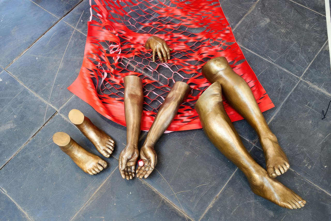 “In Silence” was born out of a memory of the next-door house burning down in the middle of the night when Shiota was a child. A burned piano and audience seating are covered, with the entire space, in black thread. While symbolizing silence, the soundless piano plays visual music. Like skin covering the body, dresses symbolize the boundary between one’s personal interior and exterior. Suspending such a dress in a space filled with black thread imparts a sensation of presence in absence. By hanging dresses on either side of a mirror dividing a space enclosed by a steel frame, “Reflection of Space and Time” blends in the mind of the viewer the illusory dress in the mirror, and the actual dress in the space opposite. Around 2004, fifteen years after the fall of the Berlin Wall, Shiota Chiharu who moved to Germany in 1996 and is currently based in Berlin started making works using windows. At the time, Berlin was undergoing extensive redevelopment that included demolition of many buildings, and Shiota went around gathering up discarded windows. Windows exist as a boundary between the inside and outside of private spaces, but also call to mind the wall that separated East and West Germany. The work “Inside – Outsid” was first made in 2008, and there are several versions. The installation “Accumulation – Searching for the Destination” is made up of around 430 oscillating suitcases. Shiota was inspired to create the installation by the discovery of old newspapers in a suitcase she found in Berlin. All things have their own, innate memories, and in this case, the suitcases seem to suggest the memories, movement and migration of strangers; or the refugee’s journey in search of a fixed abode; that is, the very journeys of people’s lives. “Where to Go, What to Exist” consists of personal photos, newspaper cuttings, rubble from buildings and other ephemera all gathered from somewhere – objects that suggest a lost past – are packed into old suitcases. Carrying someone’s memories in the form of keepsakes and souvenirs into a future where nothing is guaranteed, the cases seem to embody the thoughts of people living in an uncertain world, who yet seek the certainty of existence. “Out of My Body”, body parts began to appear in Shiota’s works following the 2017 return of her cancer and battle with the disease. Behind this was the experience of feeling that as she found herself on the treatment conveyor belt – having parts of her body removed, and undergoing chemotherapy – her soul was being left behind. For Shiota, who has always sensed the presence of life’s workings in absence, using her body as a work of art may involve imagining that absence.