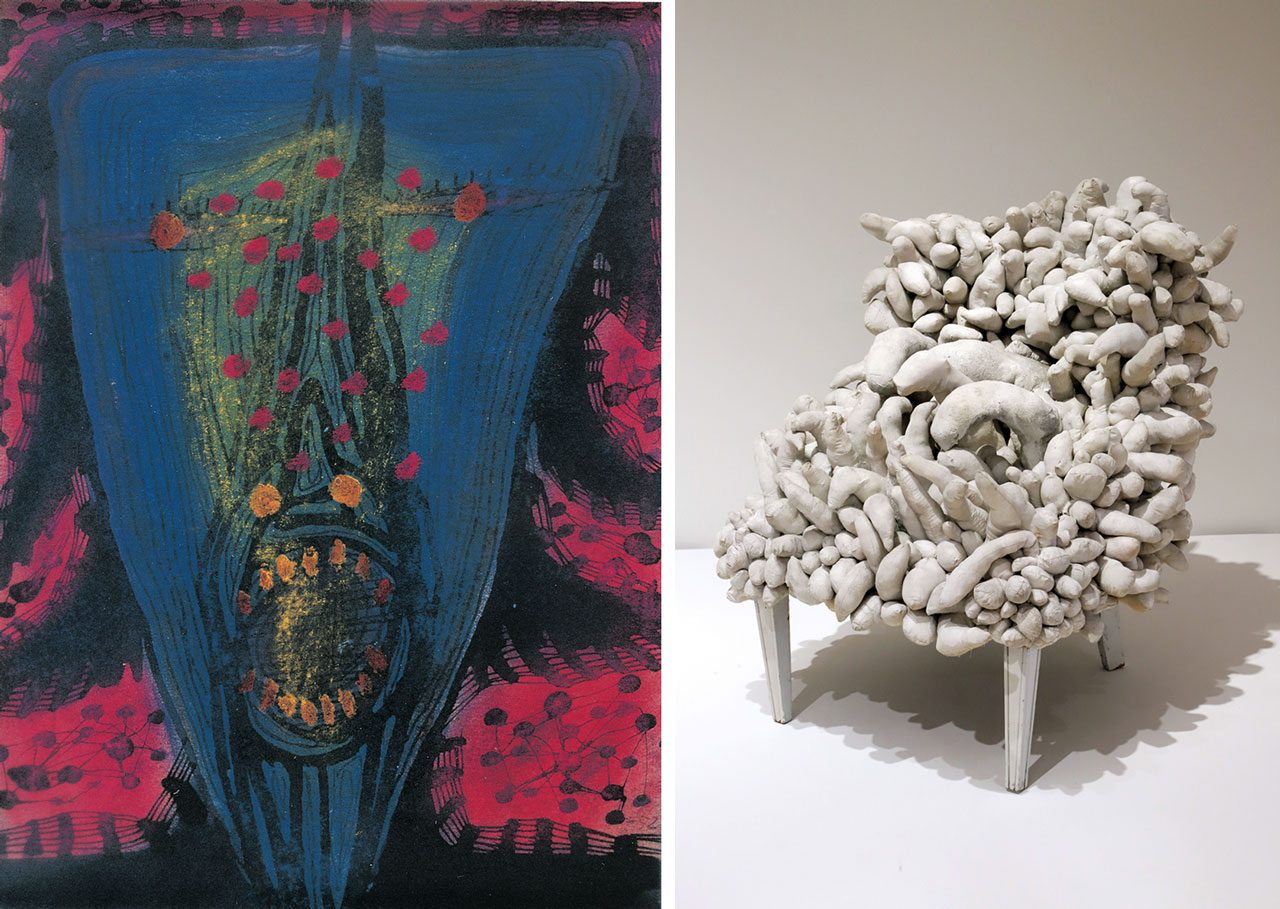 Right: Yayoi Kusama, ntitled (Chair), 1963, Chair, sewn and stuffed fabric and paint, 81 × 93 × 92 cm, Collection of the artist, © Yayoi Kusama