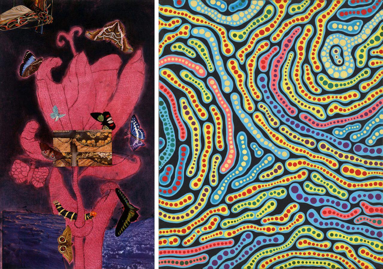 Right: Yayoi Kusama, Rain of City, 1987, Acrylic on canvas, 45.5 x 38 cm, Collection of the artist, © Yayoi Kusama